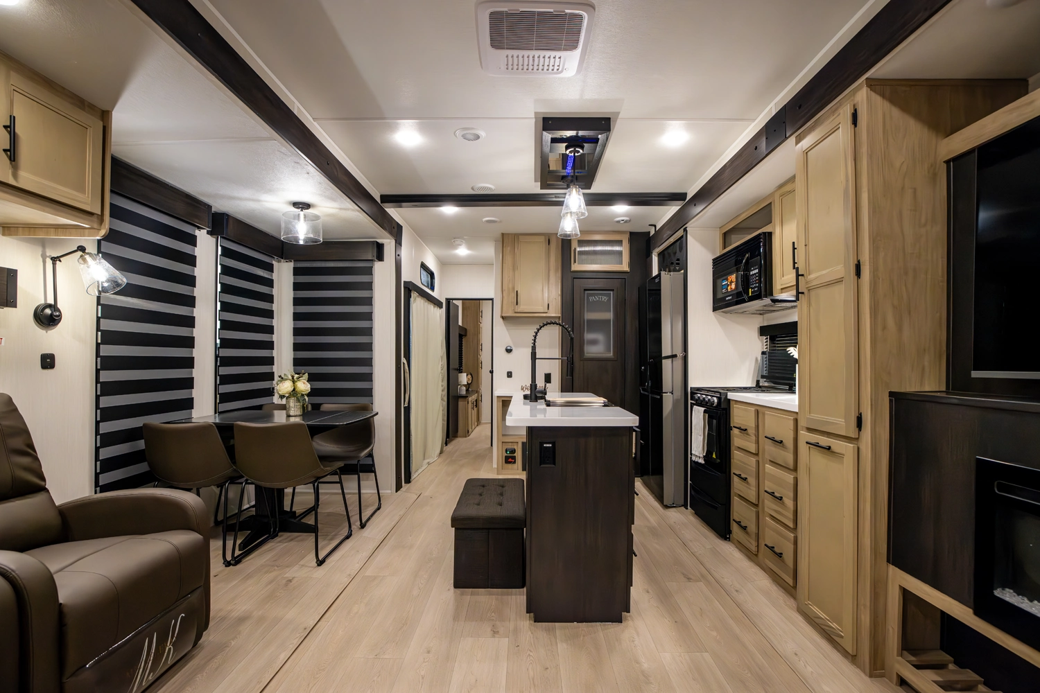 • Cherokee Black Label Timberwolf (Deep Tinted Frameless Automotive Glass Windows, High Gloss Gel Coat Exterior Sidewalls, Multicolor Reading Lights, Pillowtop Mattress Upgrade, Thermo Foil Arctic Insulation, Wall Controlled Power Shades for Living Room and Kitchen)
