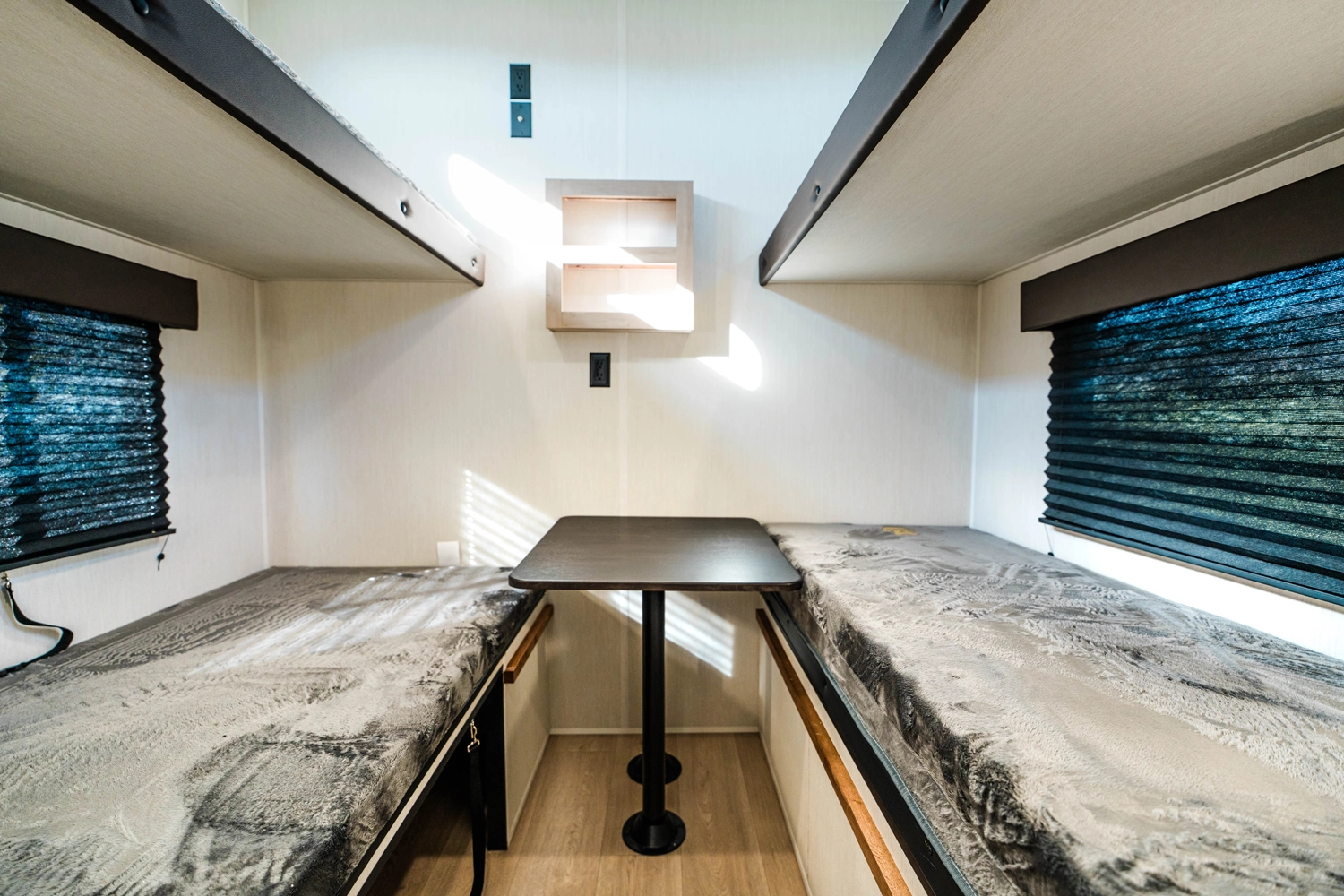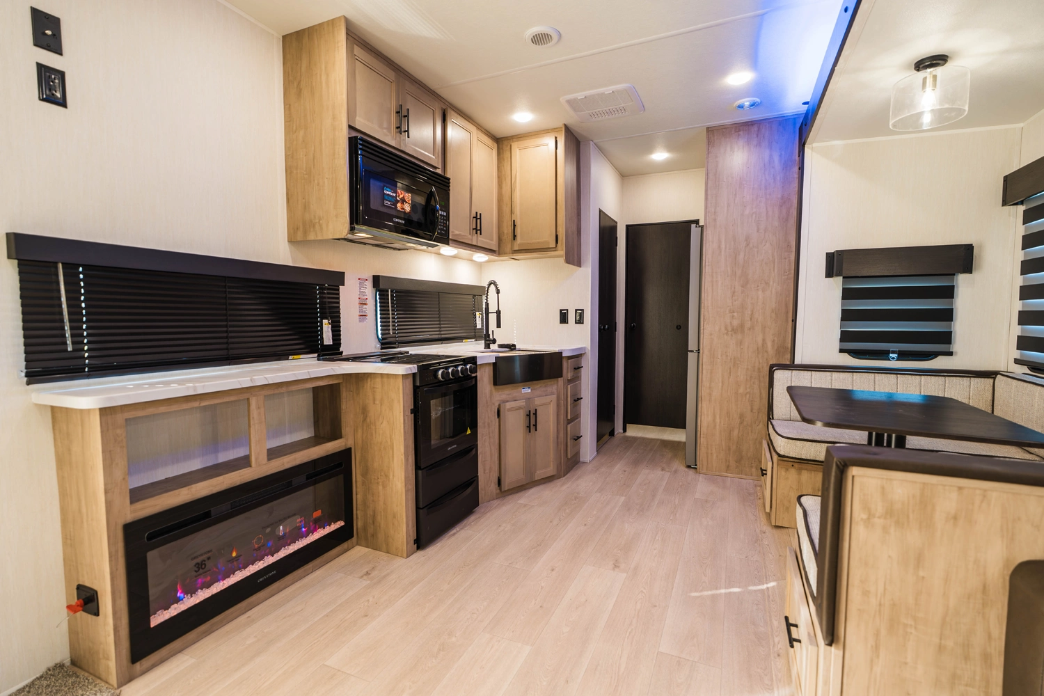 • Cherokee Black Label Timberwolf (Deep Tinted Frameless Automotive Glass Windows, High Gloss Gel Coat Exterior Sidewalls, Multicolor Reading Lights, Pillowtop Mattress Upgrade, Thermo Foil Arctic Insulation, Wall Controlled Power Shades for Living Room and Kitchen)