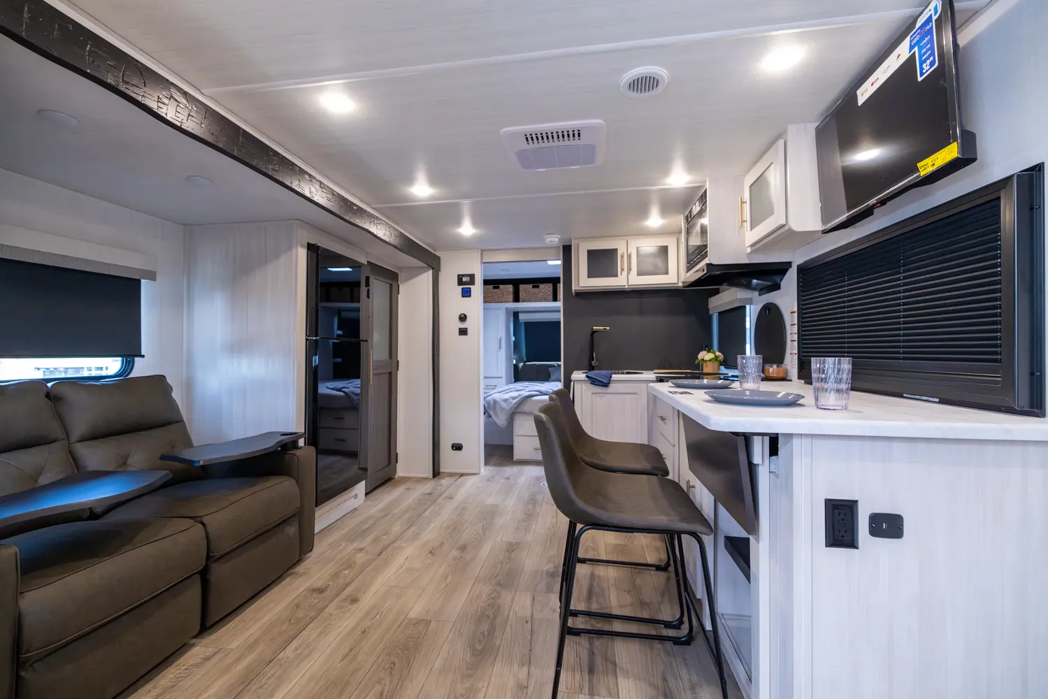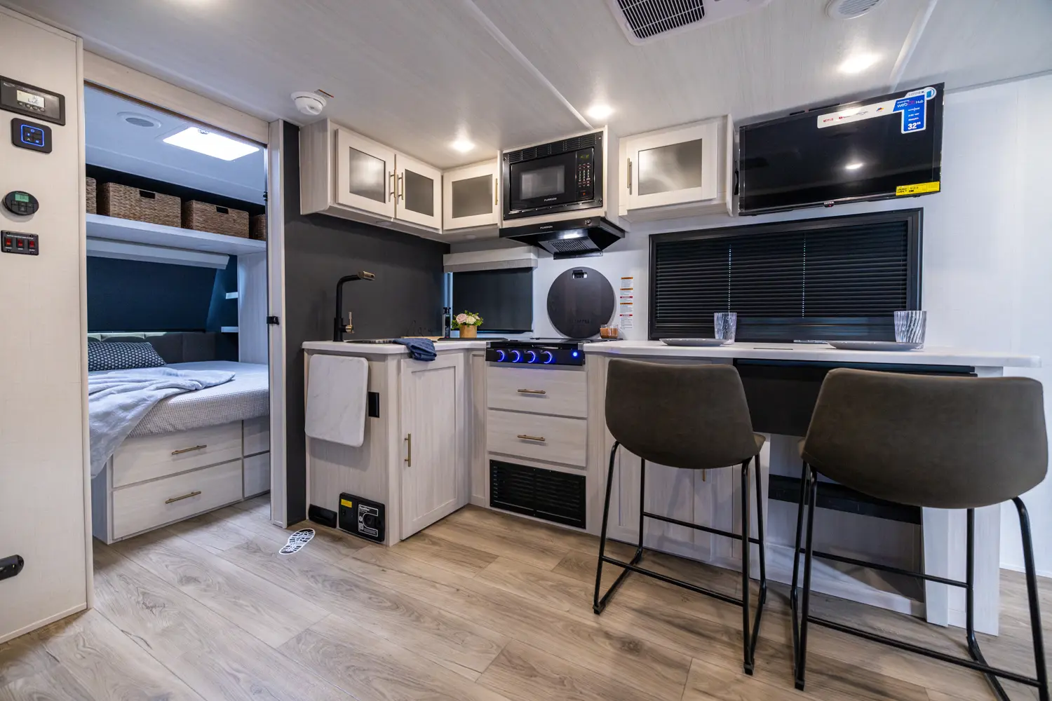 The Un•Mapped 22RB offers a front king bed and full rear bath. The kitchen features a bar top with flip-up window, convection microwave, and 12V refrigerator, plus a bar-to-table conversion for flexible dining. Inside, theater seating provides comfort, while outside, enjoy a TrailGate outdoor bar, 19' power awning, and hot & cold spray port—perfect for compact adventures.