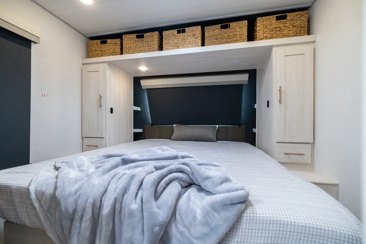 The Un•Mapped 25RL features a rear living area with theater seating and a pull-out ottoman, creating a cozy, flexible space. The kitchen is equipped with a 12V black glass refrigerator and an air fryer microwave. The custom king bed ensures a restful night's sleep. Exterior amenities include a 21' powered awning, outdoor camp kitchen, and a hot & cold spray port, perfect for compact adventures.
