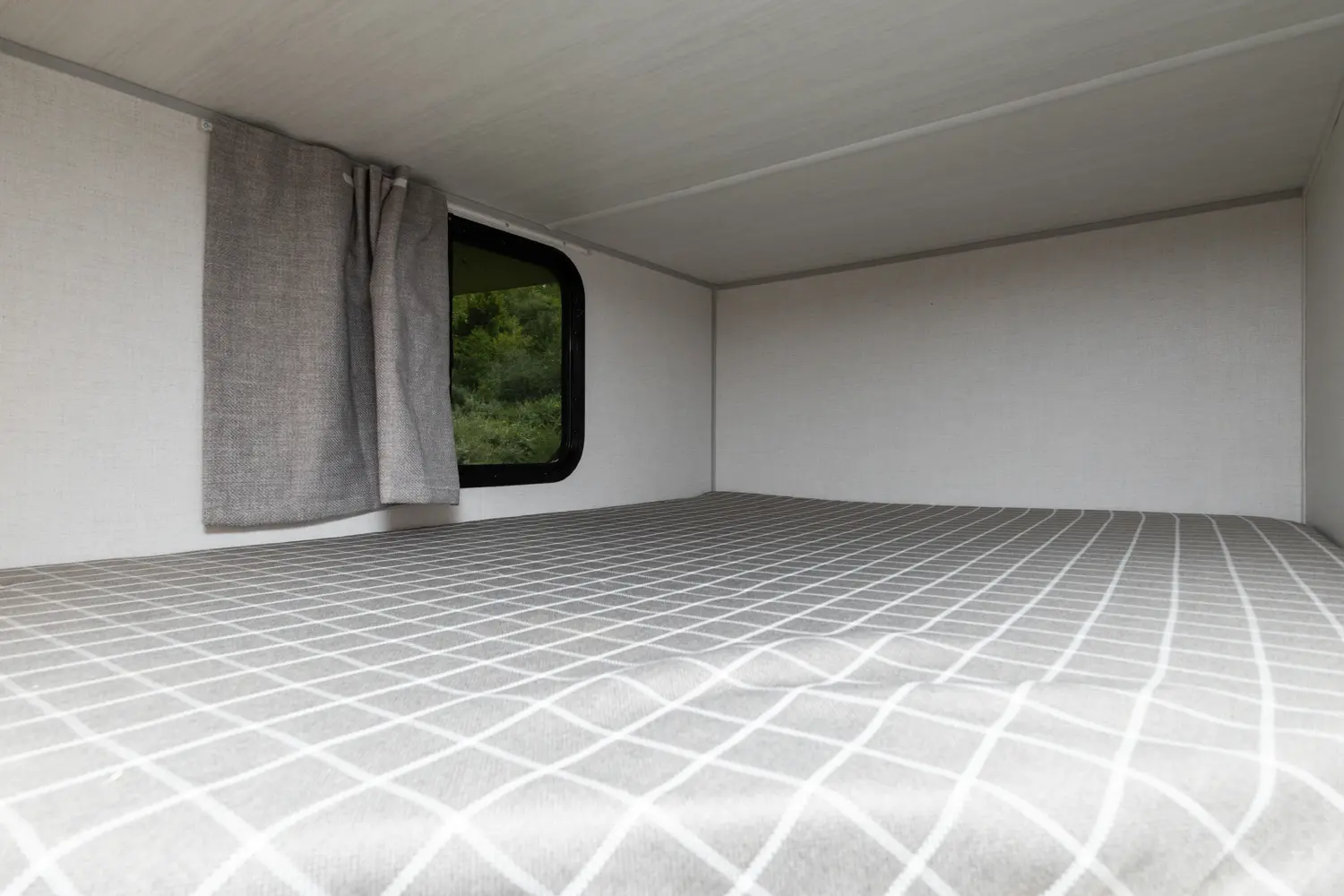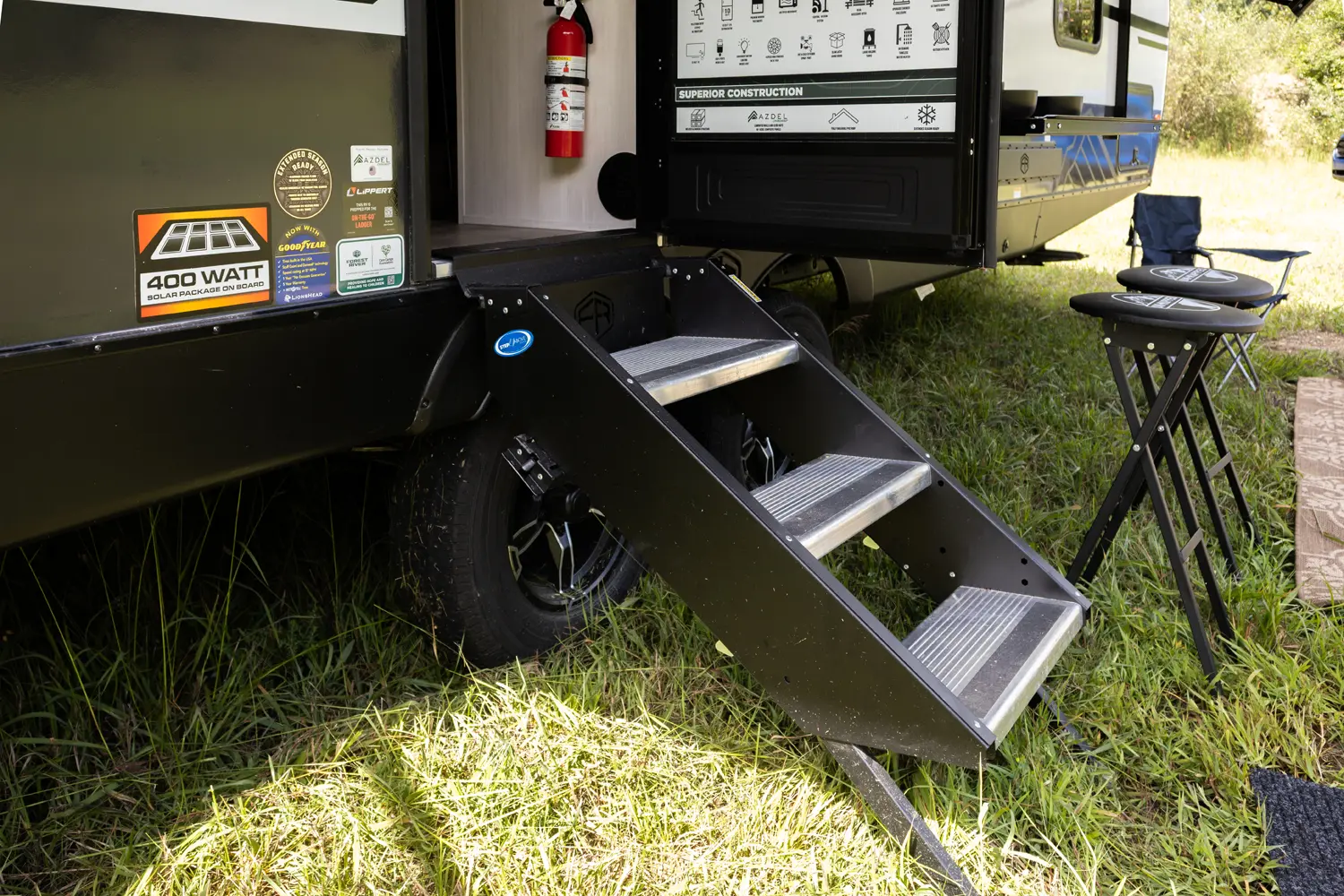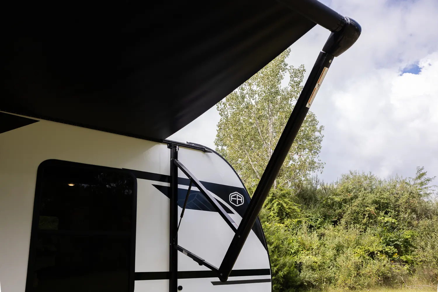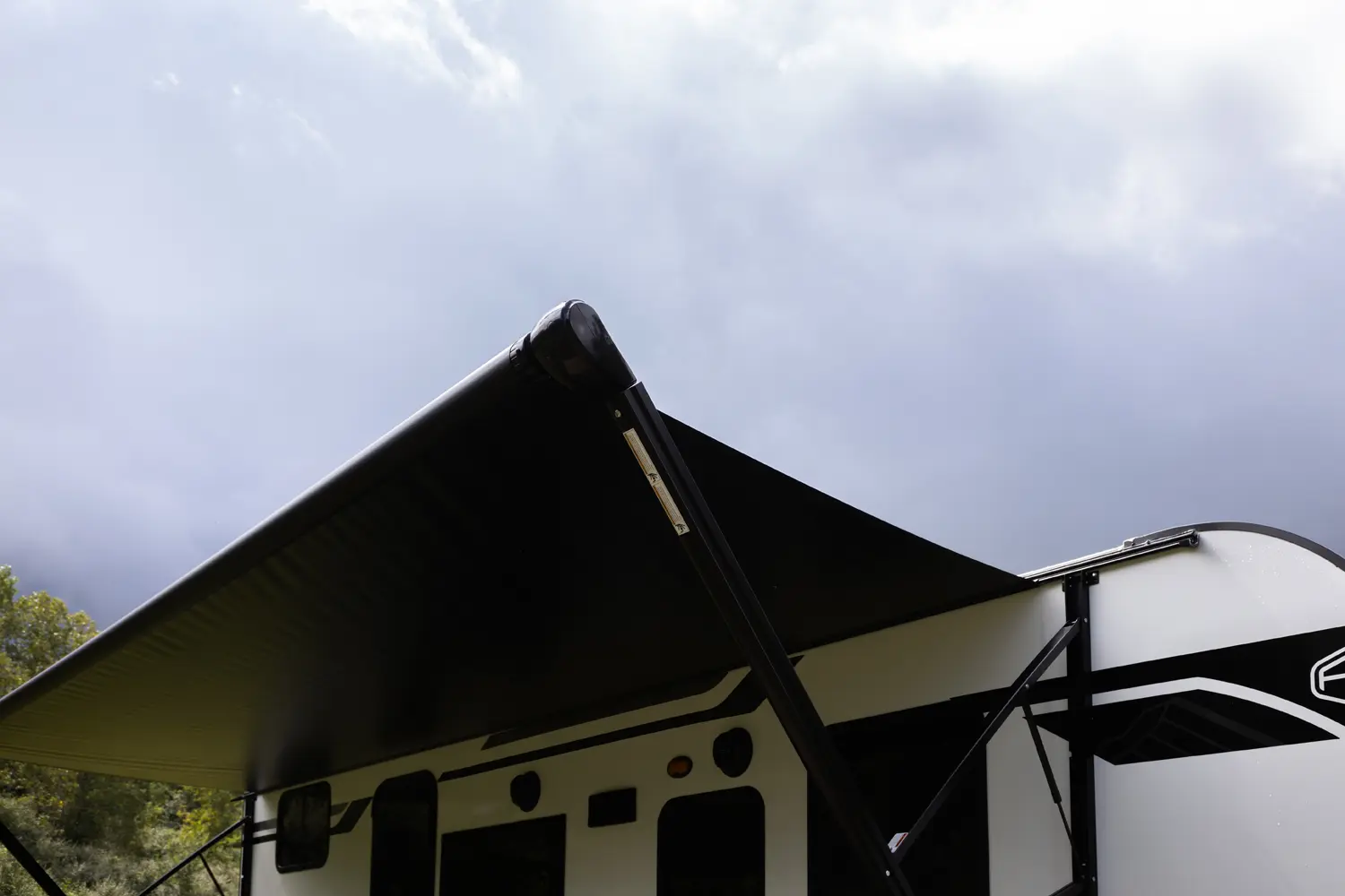 The Un•Mapped 26BH features a rear bunkhouse with double-over-double bunks, accommodating up to four sleepers. The kitchen is equipped with a 12V black glass refrigerator and an air fryer microwave. The Bar2Table pull-out dinette and TrailGate outdoor bar enhance dining flexibility and outdoor entertaining. Inside, enjoy a king bed, 15K A/C, and a tankless on-demand water heater. Exterior amenities include a 21' powered awning and a hot & cold spray port, perfect for compact adventures.
