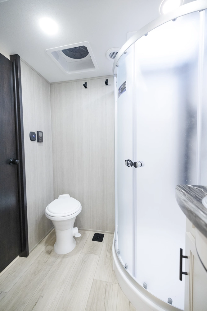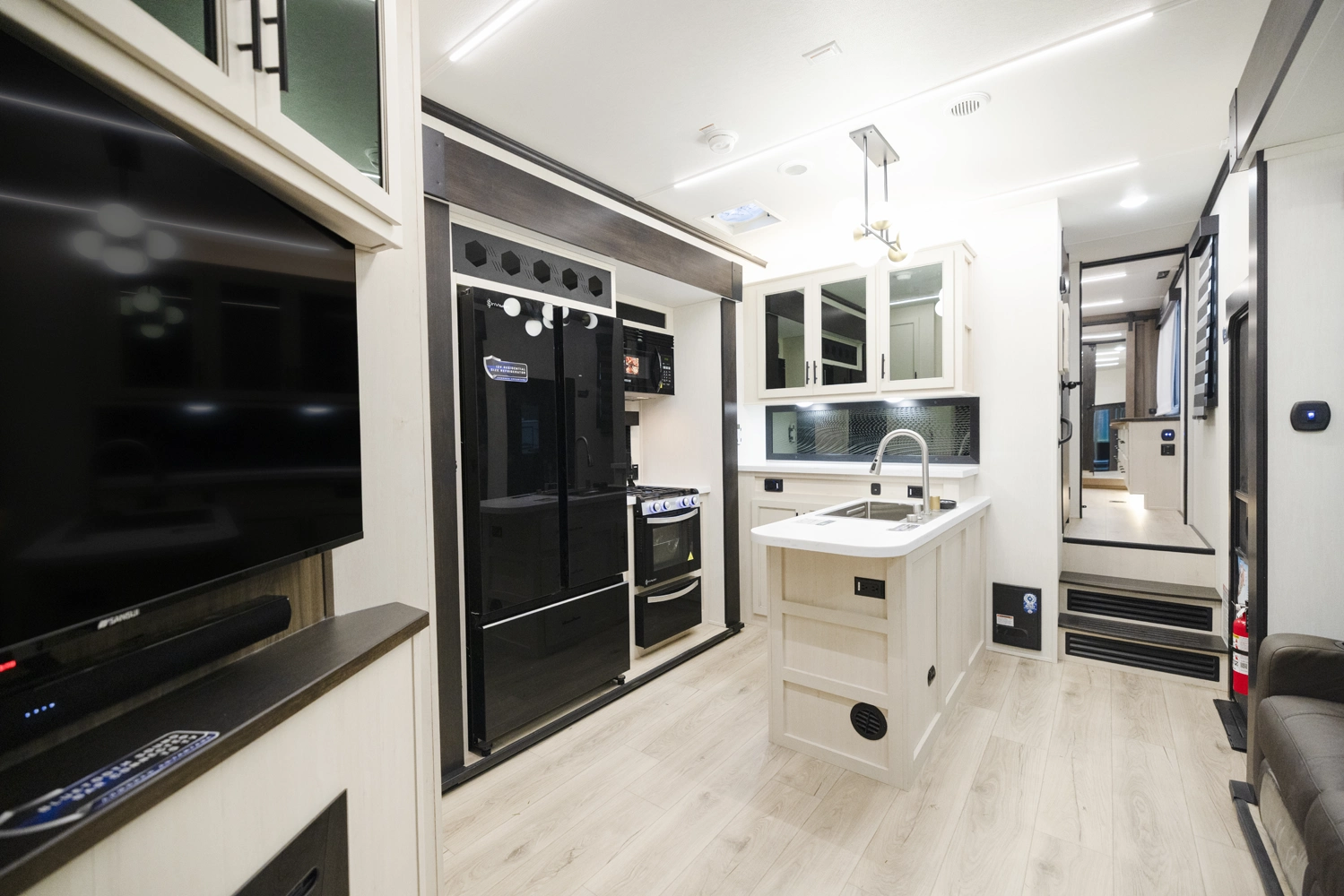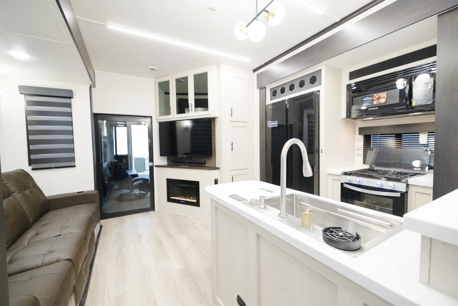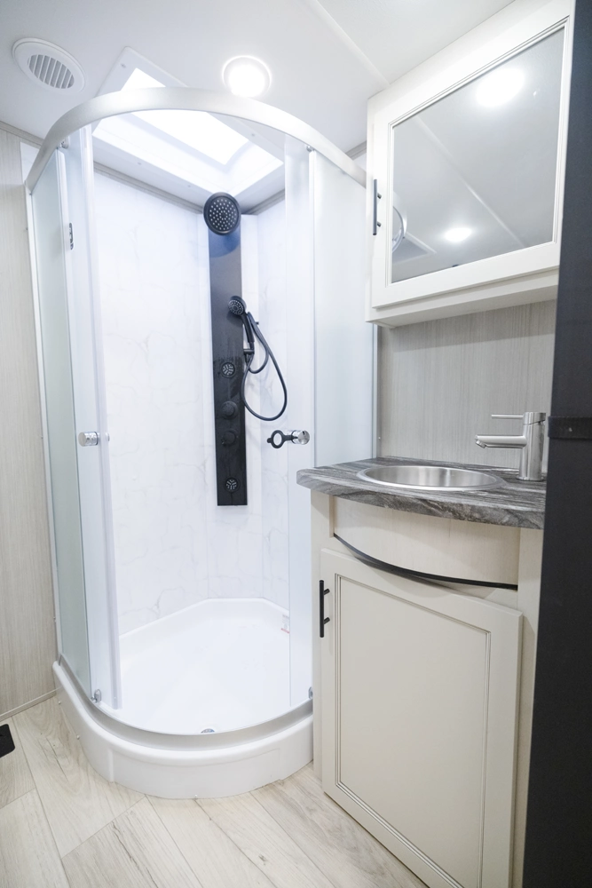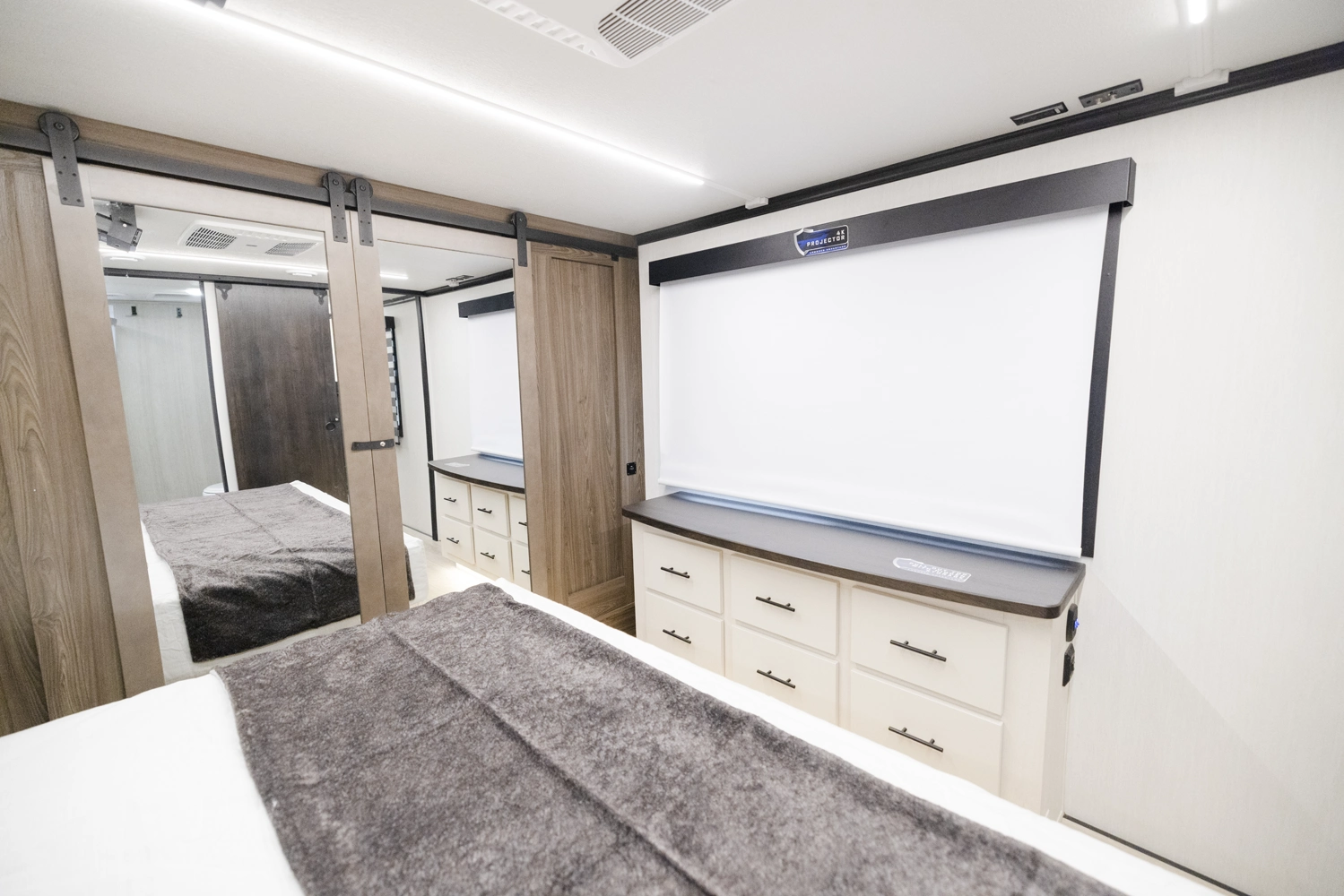 Luxury abounds in this stunning toy hauler! The kitchen features residential appliances, solid surface counter tops, stainless steel sink with pull-down sprayer, and ample storage. The high ceilings and extra tall main slideout really expand the already large space. The bathroom features a large glass shower, porcelain bowl foot flush toilet and linen closet. The bedroom features a power adjustable king bed, large dresser, front wardrobe, dedicated air conditioning and plenty of storage.