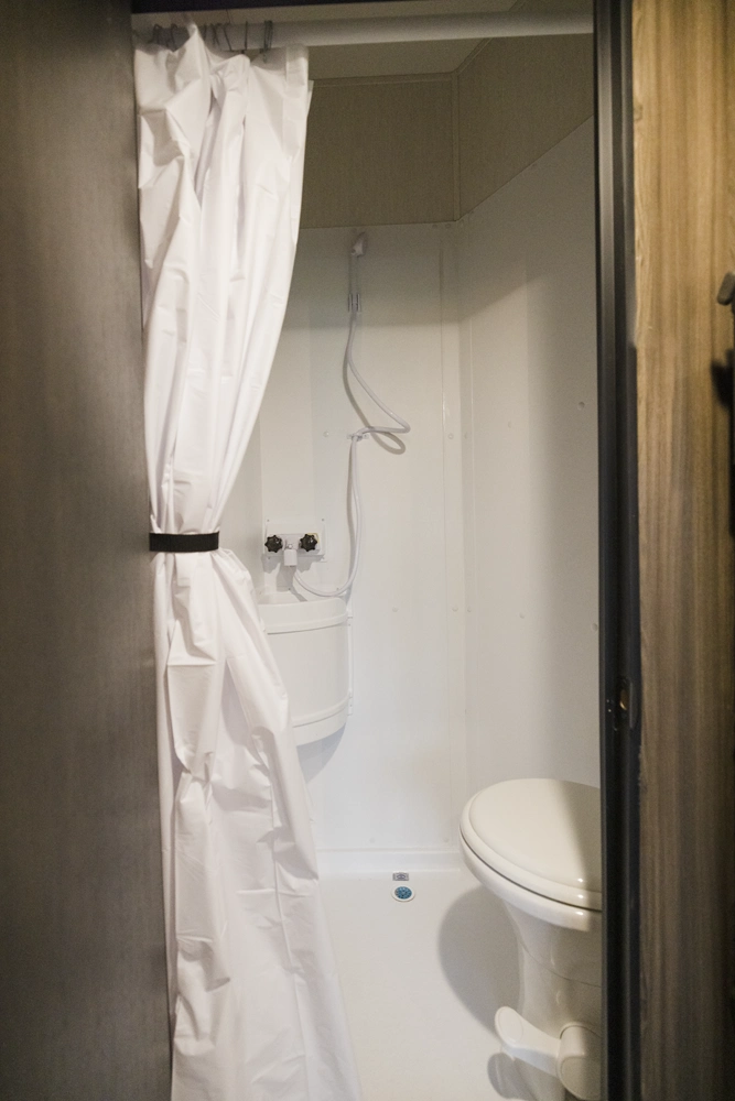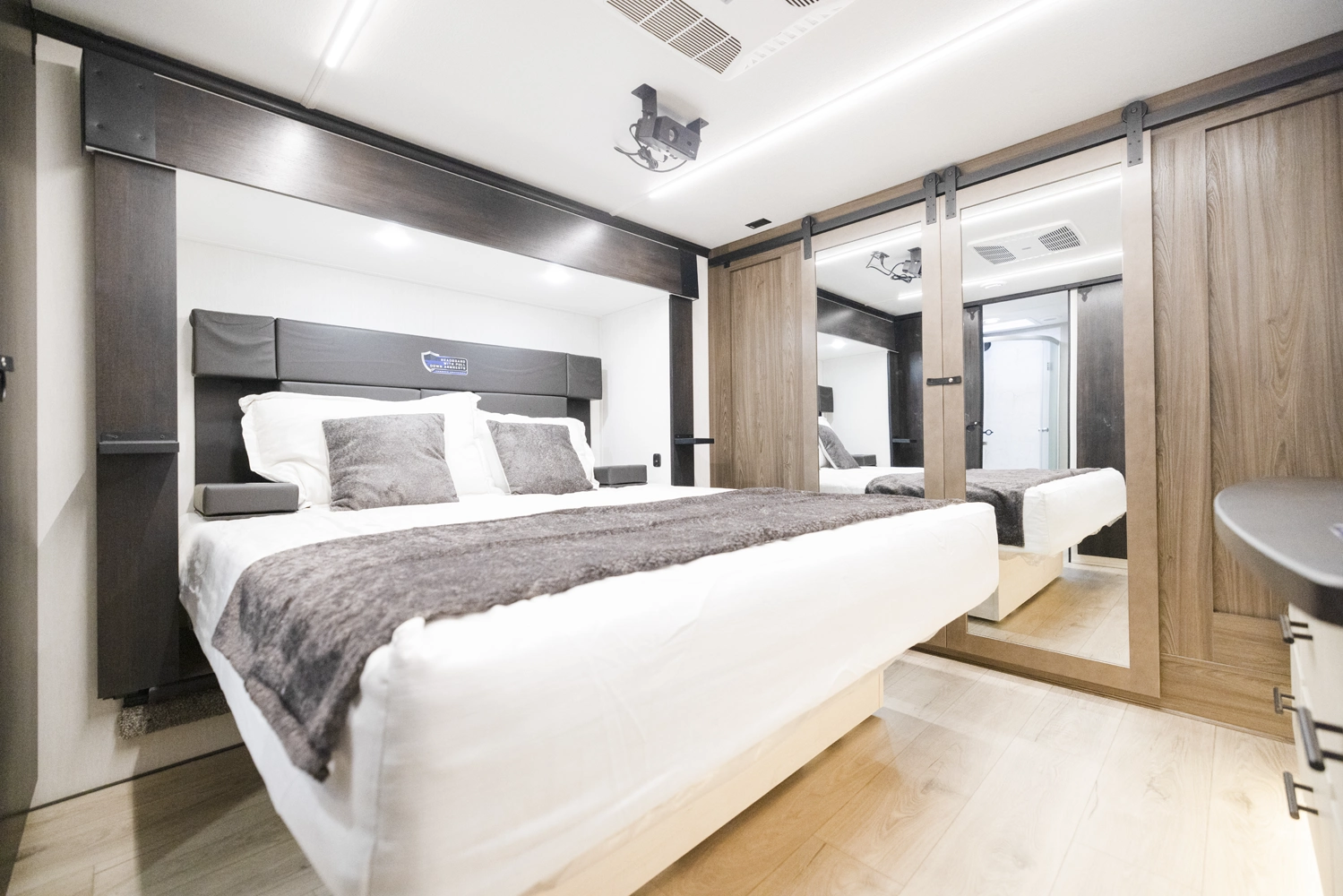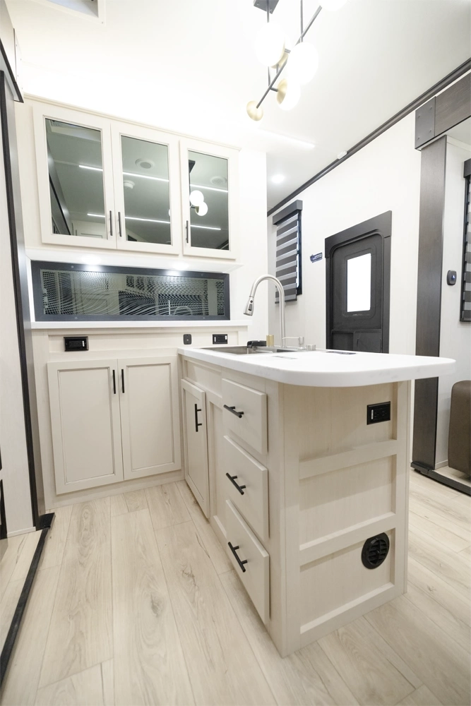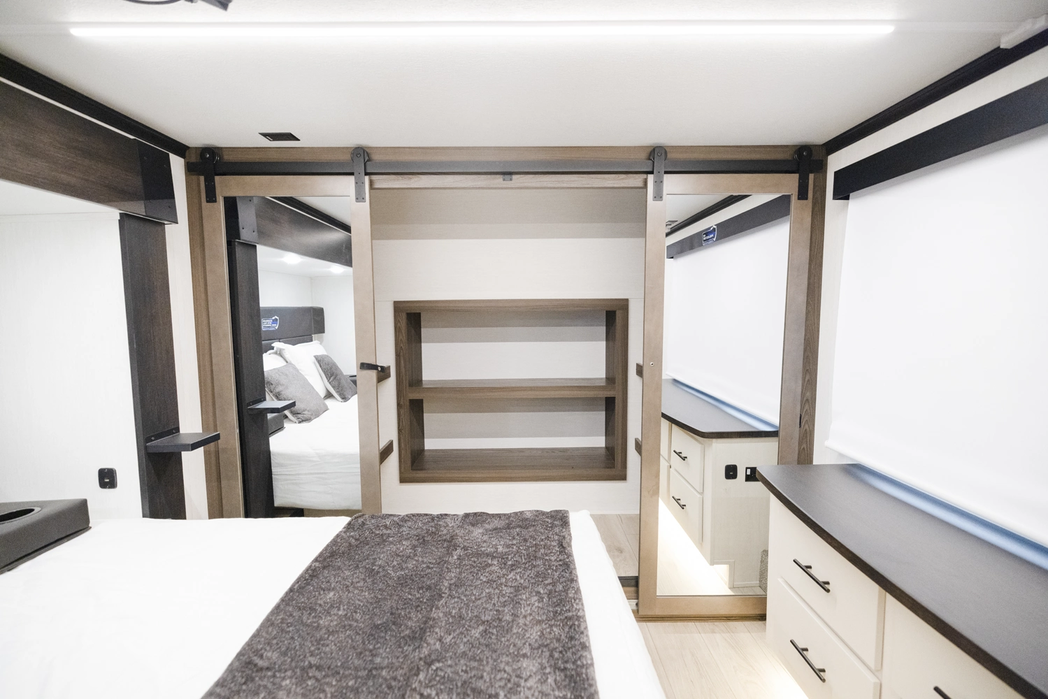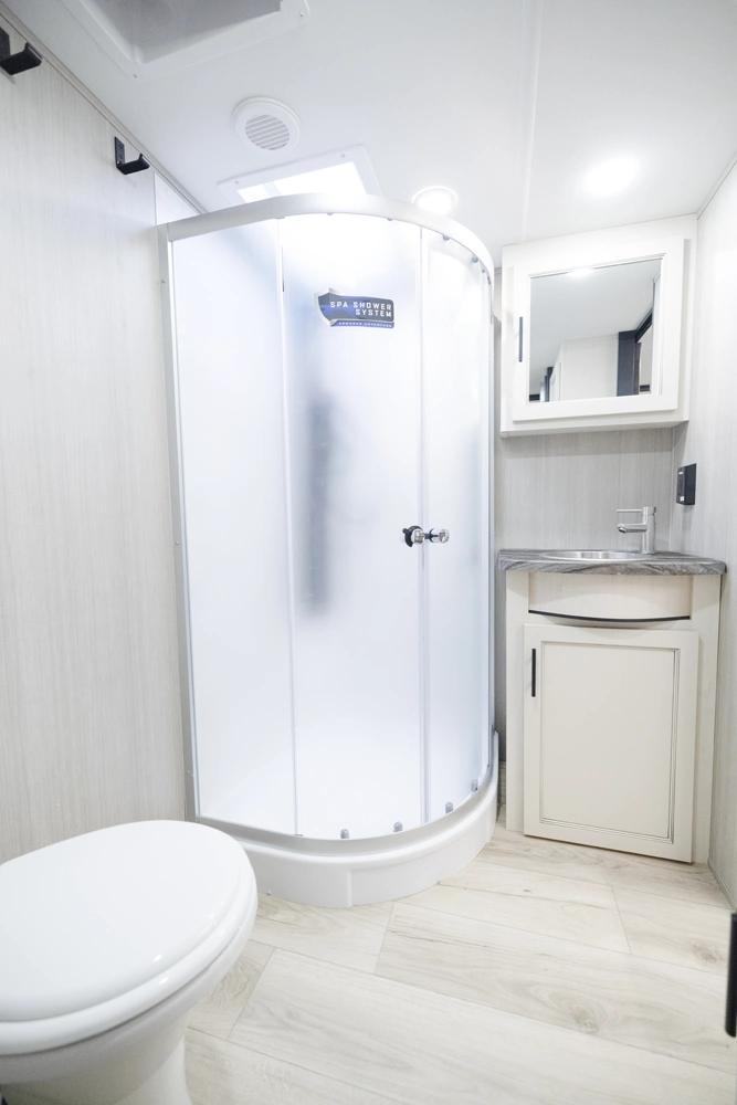 Luxury abounds in this stunning toy hauler! The kitchen features residential appliances, solid surface counter tops, stainless steel sink with pull-down sprayer, and ample storage. The high ceilings and extra tall main slideout really expand the already large space. The bathroom features a large glass shower, porcelain bowl foot flush toilet and linen closet. The bedroom features a power adjustable king bed, large dresser, front wardrobe, dedicated air conditioning and plenty of storage.