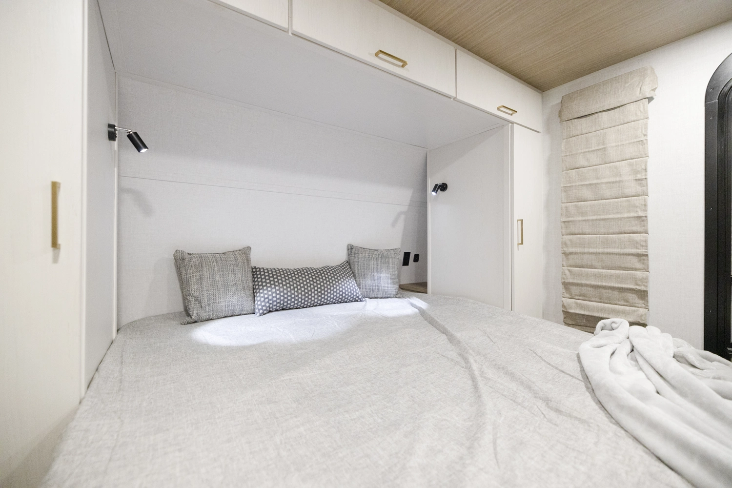 The 2400RB is great for couples who enjoy scenic views from the comfort of their living space. With almost a full panoramic view in part to our European-Style square windows, there is no shortage of natural light with a spacious open feel. The 2400RB comes packed with already added features such as 2 A/Cs, a king bed, porcelain toilet and much more!
