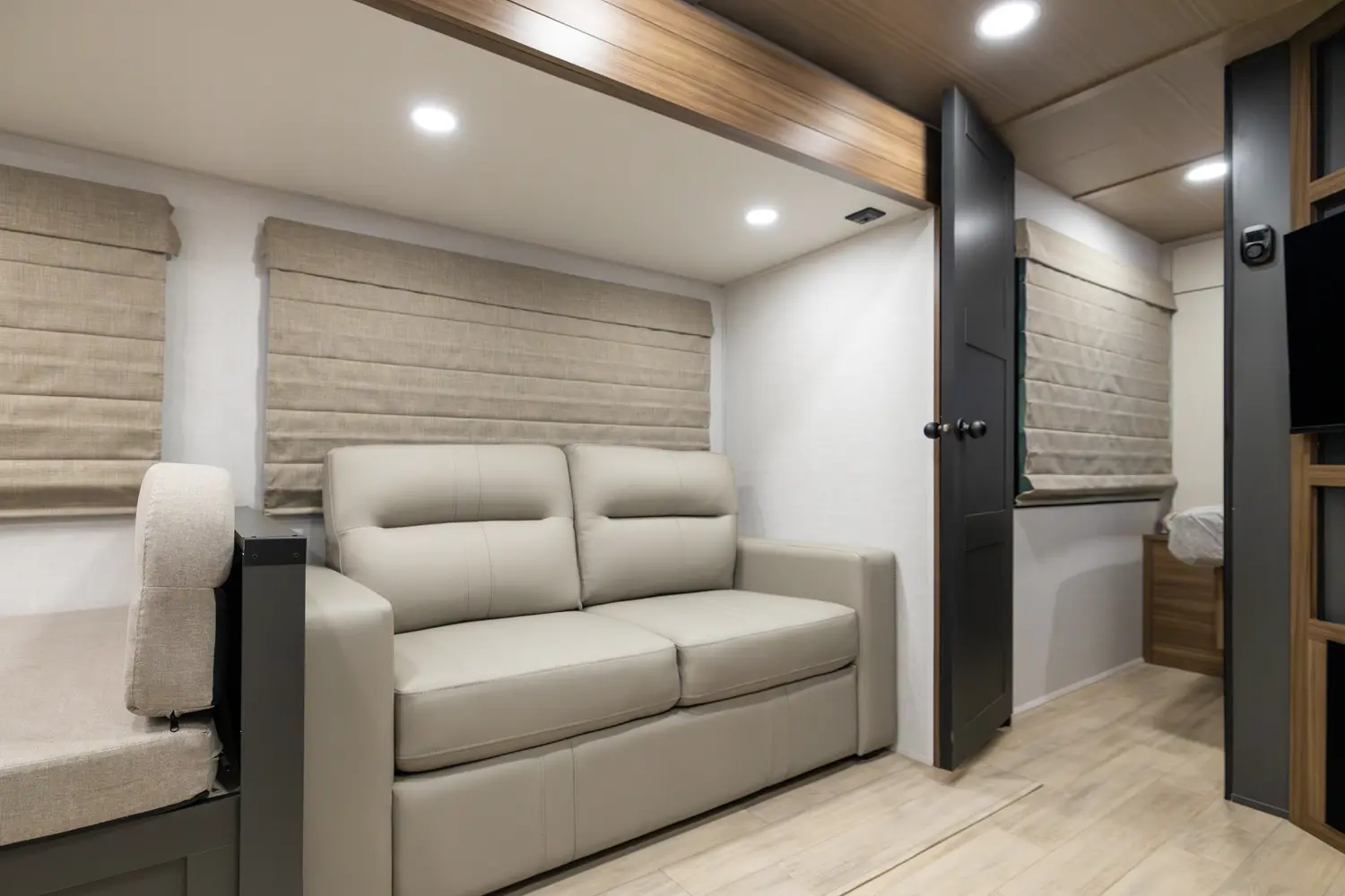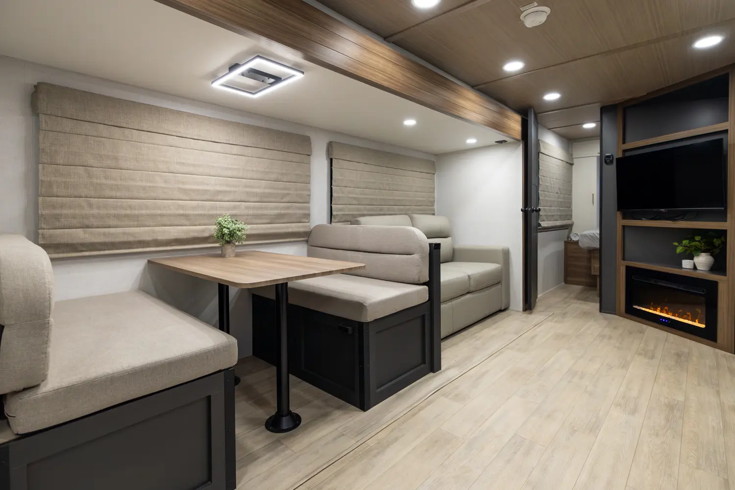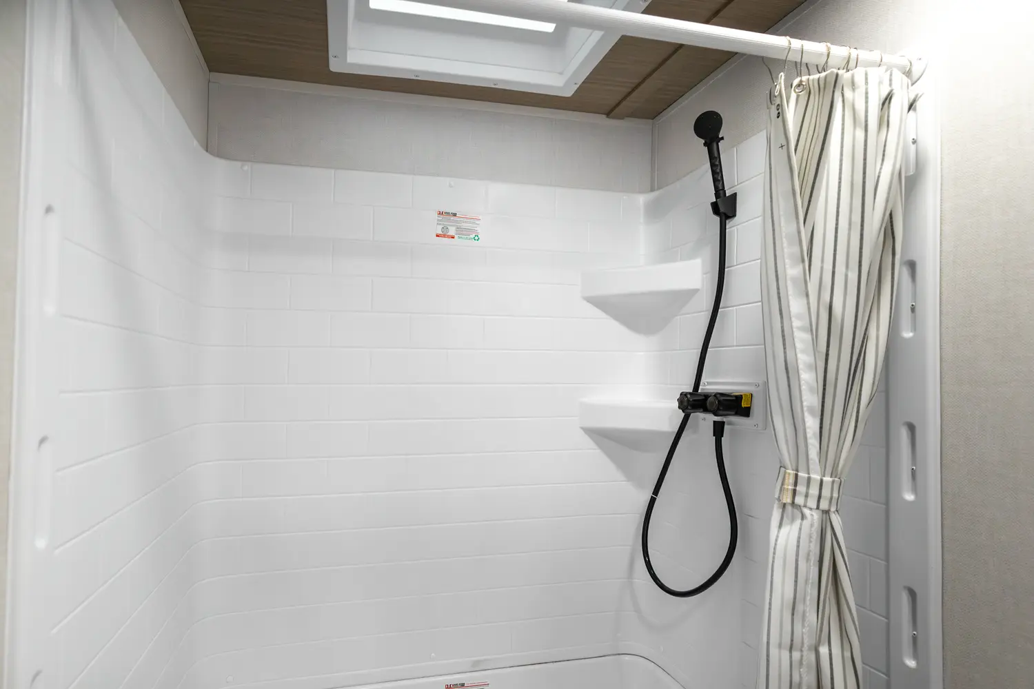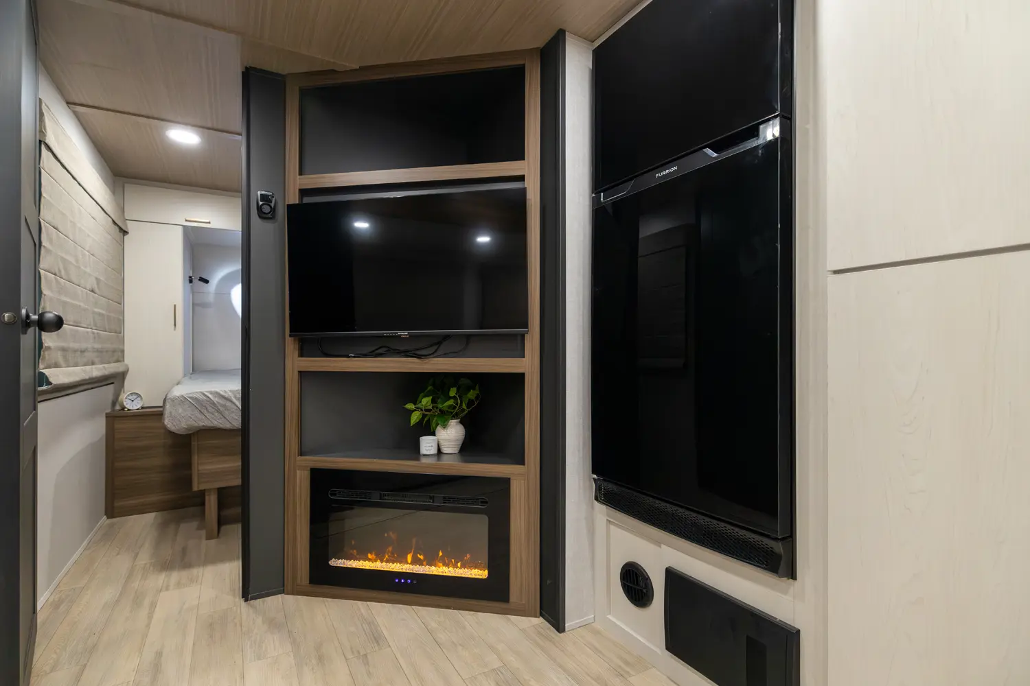 • Universal Docking Station Enclosed in Cargo Storage - Hookups Included: Cable & Satellite Switch, Fresh-Tank Gravity Fill, City Water, Black Tank Flush, Winterization Pump, Outdoor Shower, GFI Outlet, And Space Prepped for Solar Panel Controller
