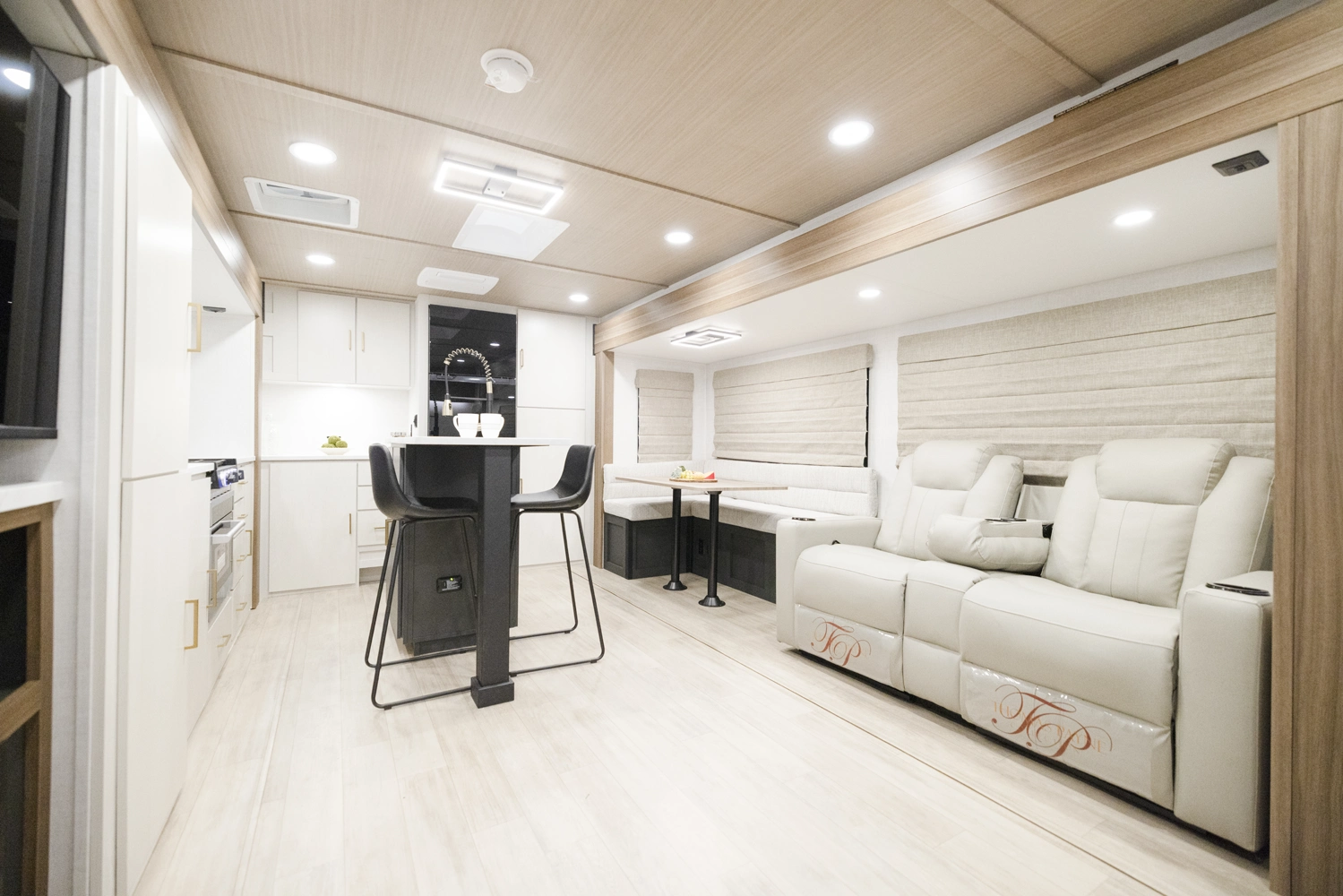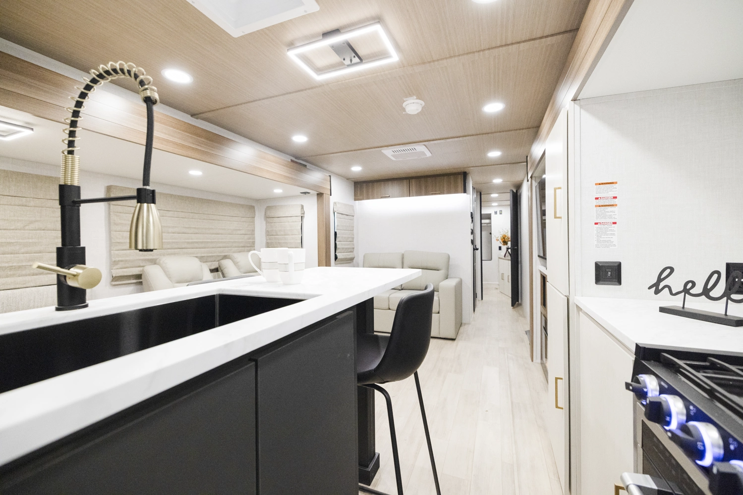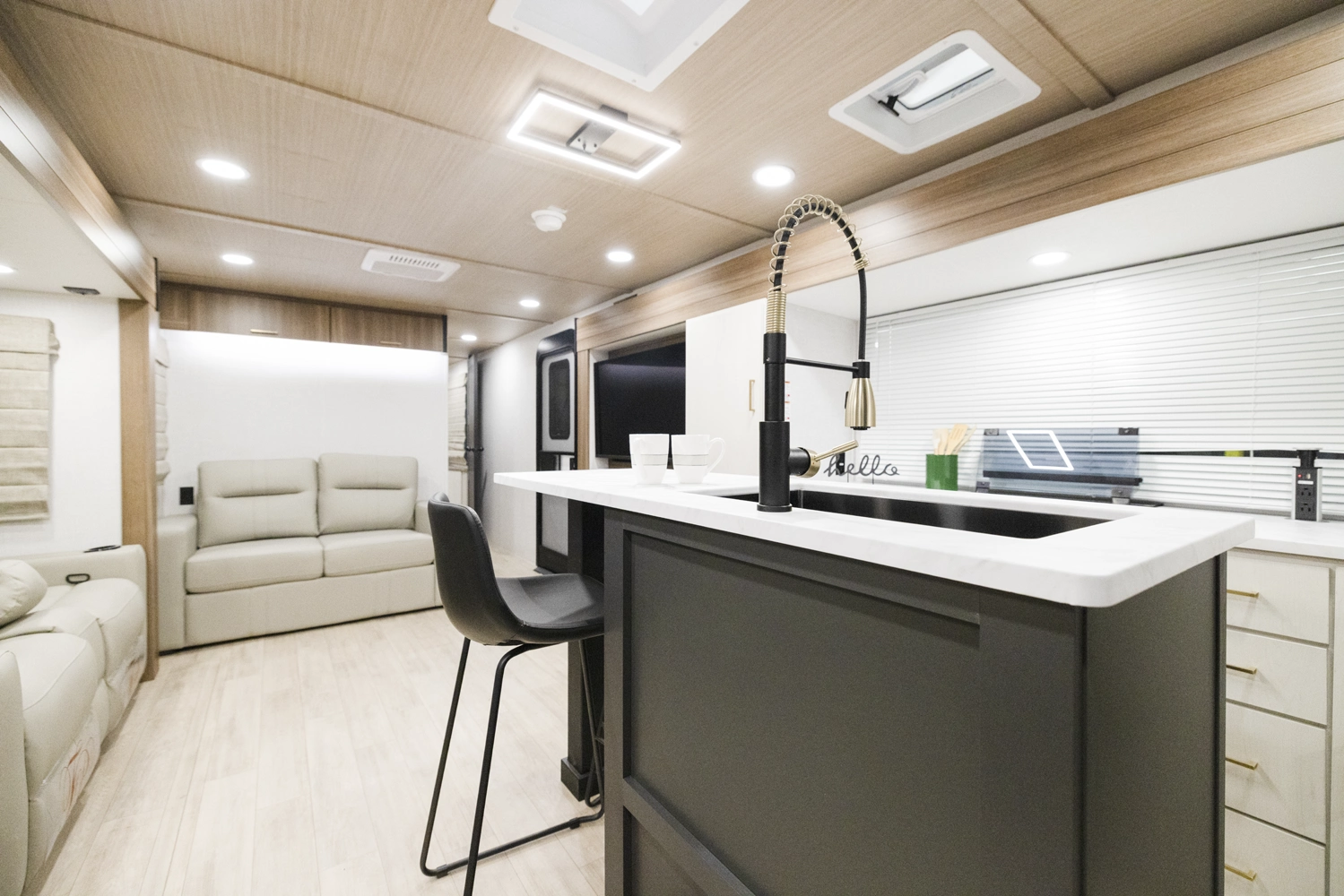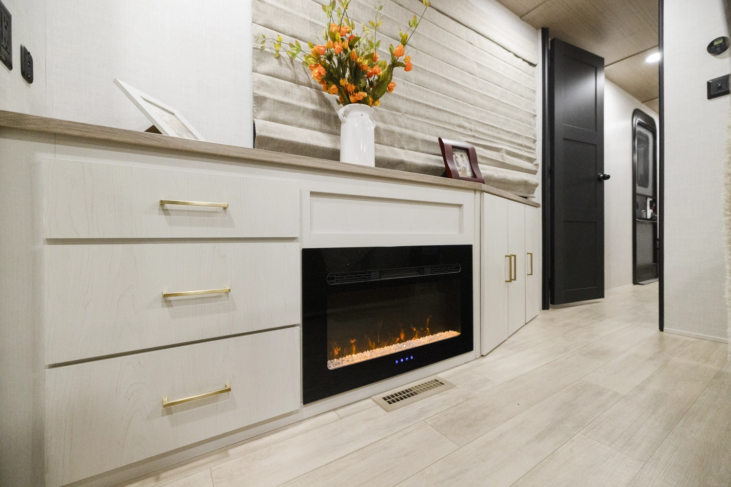 The 3400XL is a luxurious travel trailer perfect for couples or people looking for a large bedroom and plenty entertainment space. This coach features a wine fridge, extra electric fireplace, and a large reach-in closet in addition to your washer/dryer prep. This coach offers the most effective use of counter space and island space. Complete with a King Bed inside of your luxurious master bedroom suite. This travel trailer has everything you need for a fun-packed camping trip.