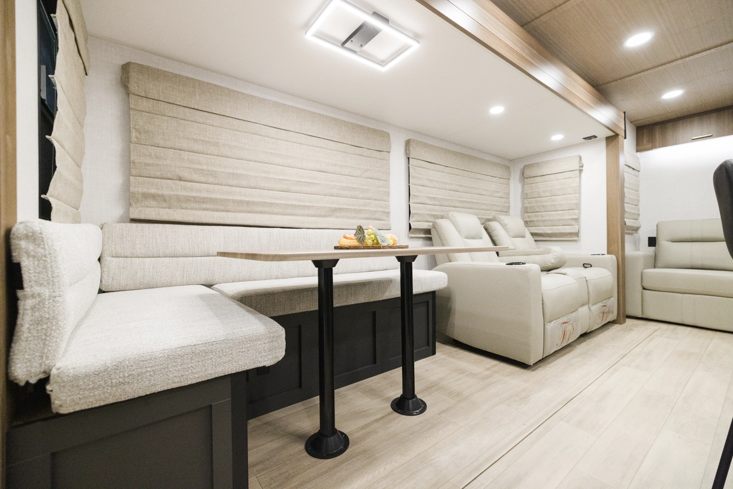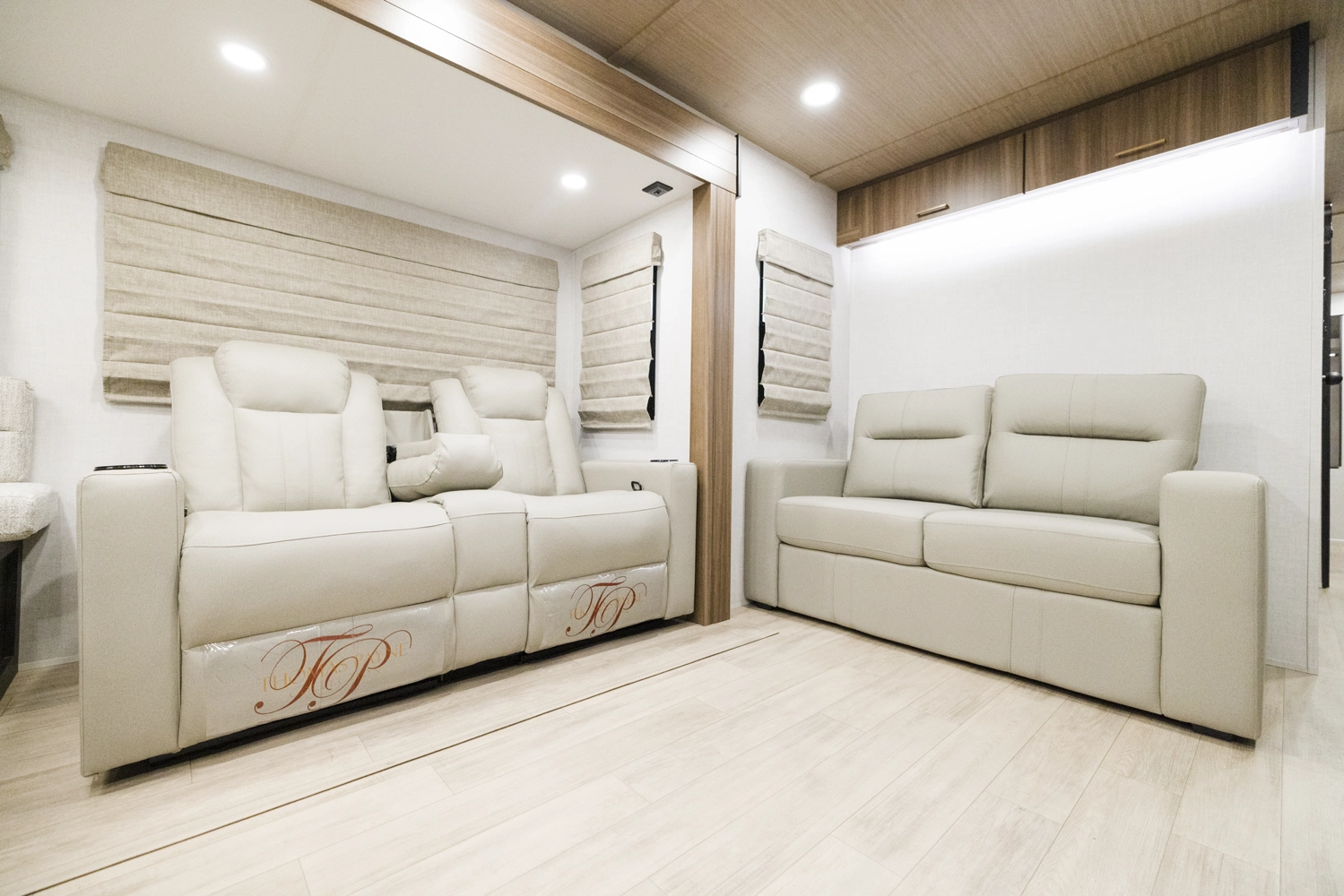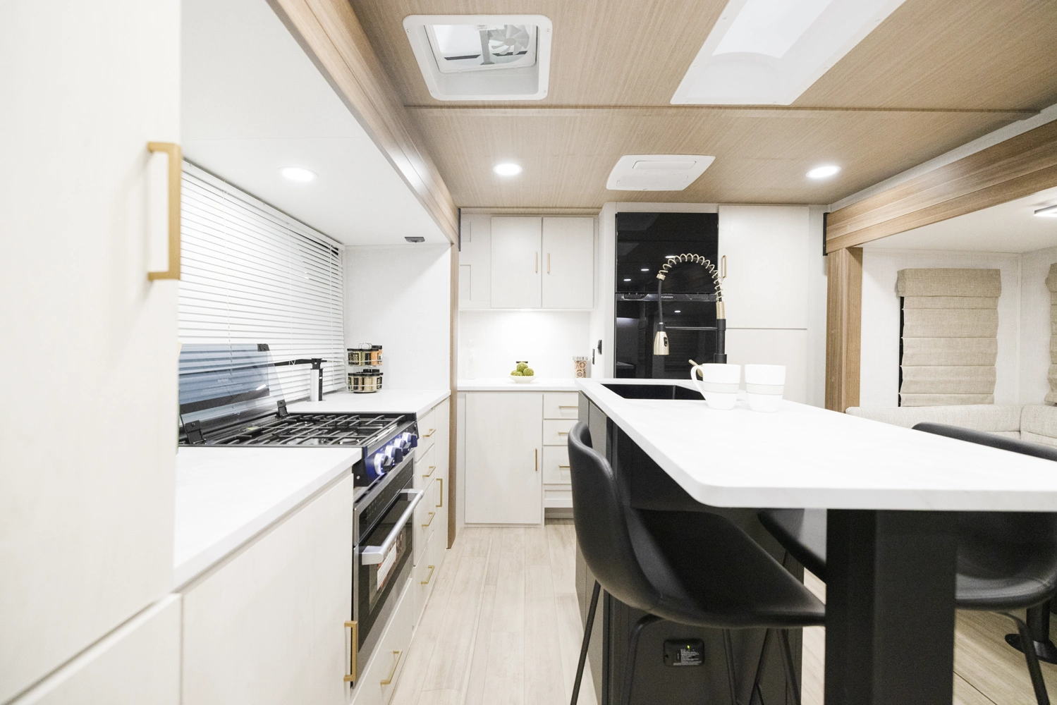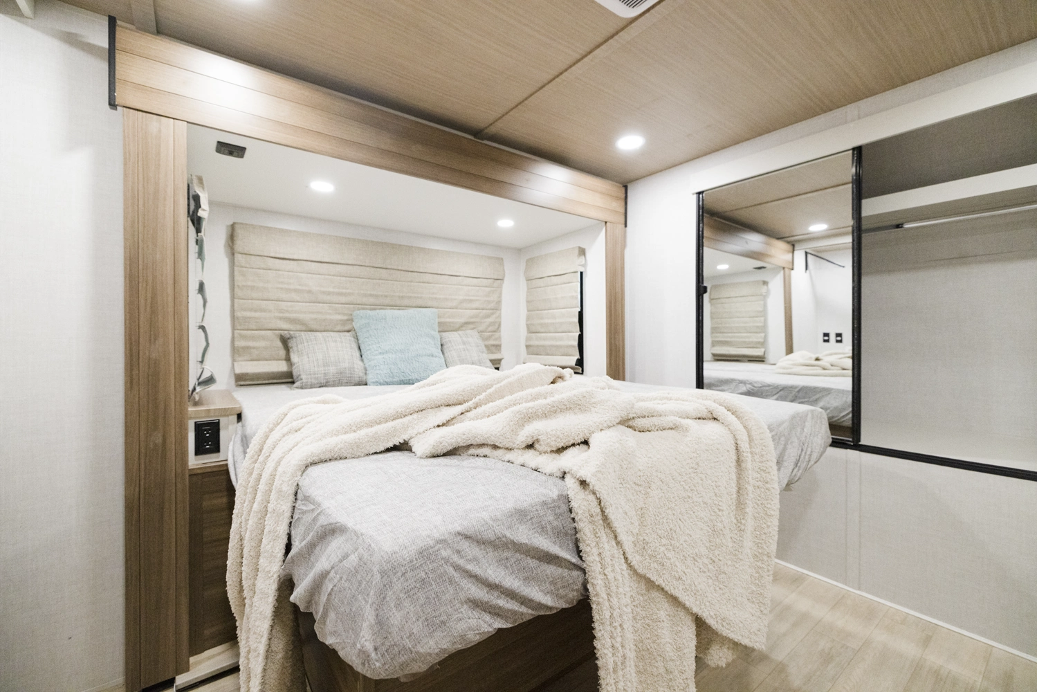 The 3400XL is a luxurious travel trailer perfect for couples or people looking for a large bedroom and plenty entertainment space. This coach features a wine fridge, extra electric fireplace, and a large reach-in closet in addition to your washer/dryer prep. This coach offers the most effective use of counter space and island space. Complete with a King Bed inside of your luxurious master bedroom suite. This travel trailer has everything you need for a fun-packed camping trip.