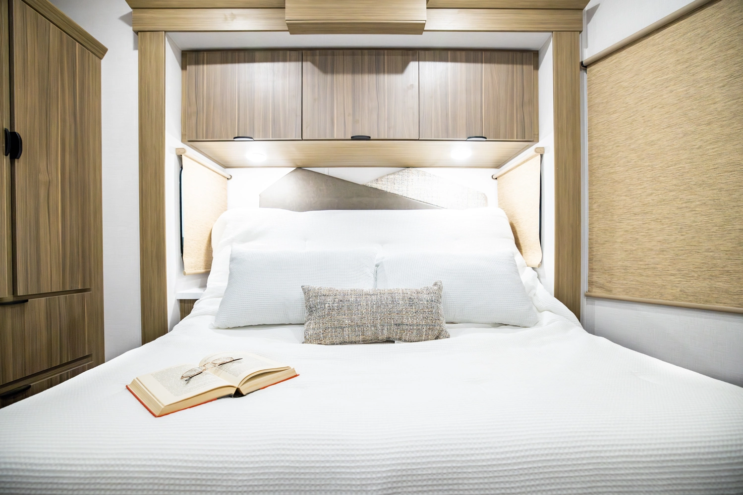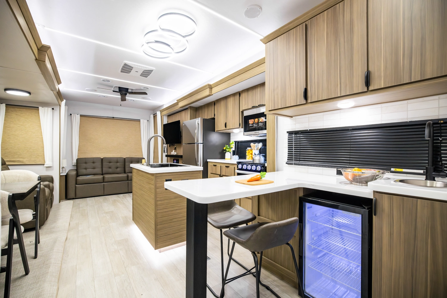 The 40RLB is an open floorplan that maximizes space for a residential cottage look and feel. The large king bedroom provides plenty of storage and washer/dryer hookup. The bathroom offers a walk-in shower with built-in seat, skylight, and linen cabinets. The island kitchen provides residential appliances and plenty of room for all the cooking essentials. Don’t forget the awesome view out the panoramic windows.