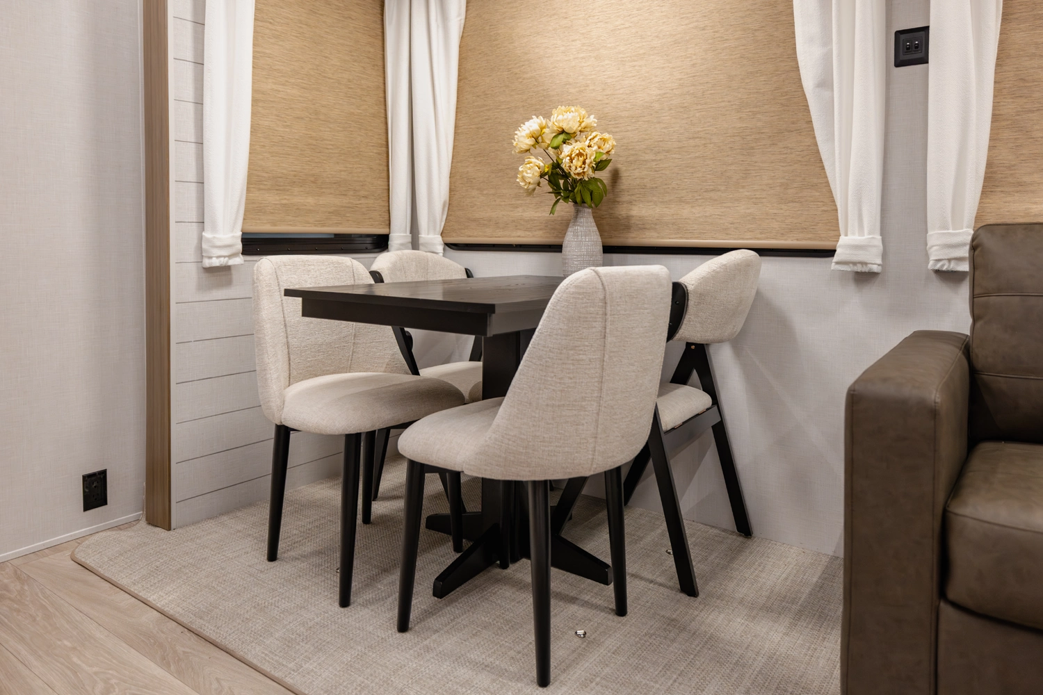 The 42QBQ is the ultimate bunkhouse, with four slides and an outdoor kitchen. The large front queen bedroom includes plenty of closet and cabinet space, while the adjacent bathroom gives you a walk-in radius shower. The living area features panoramic windows, fireplace (heater), and a tri-fold sofa. The bunk room provides 3 bunks plus the Versa-Queen giving the option of having another bunk, sofa, or queen bed. Do not forget the half bath with convenient door to the outside.