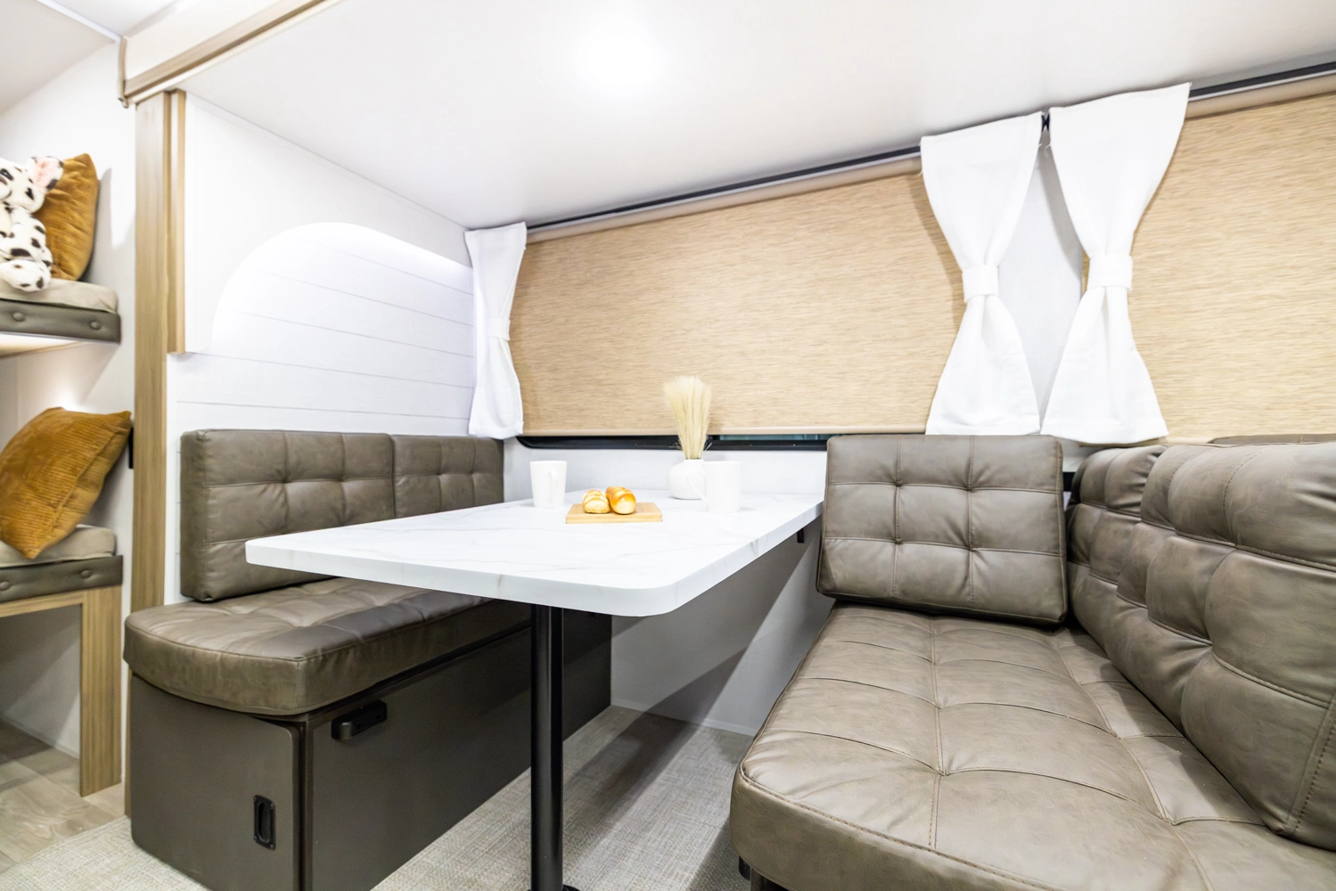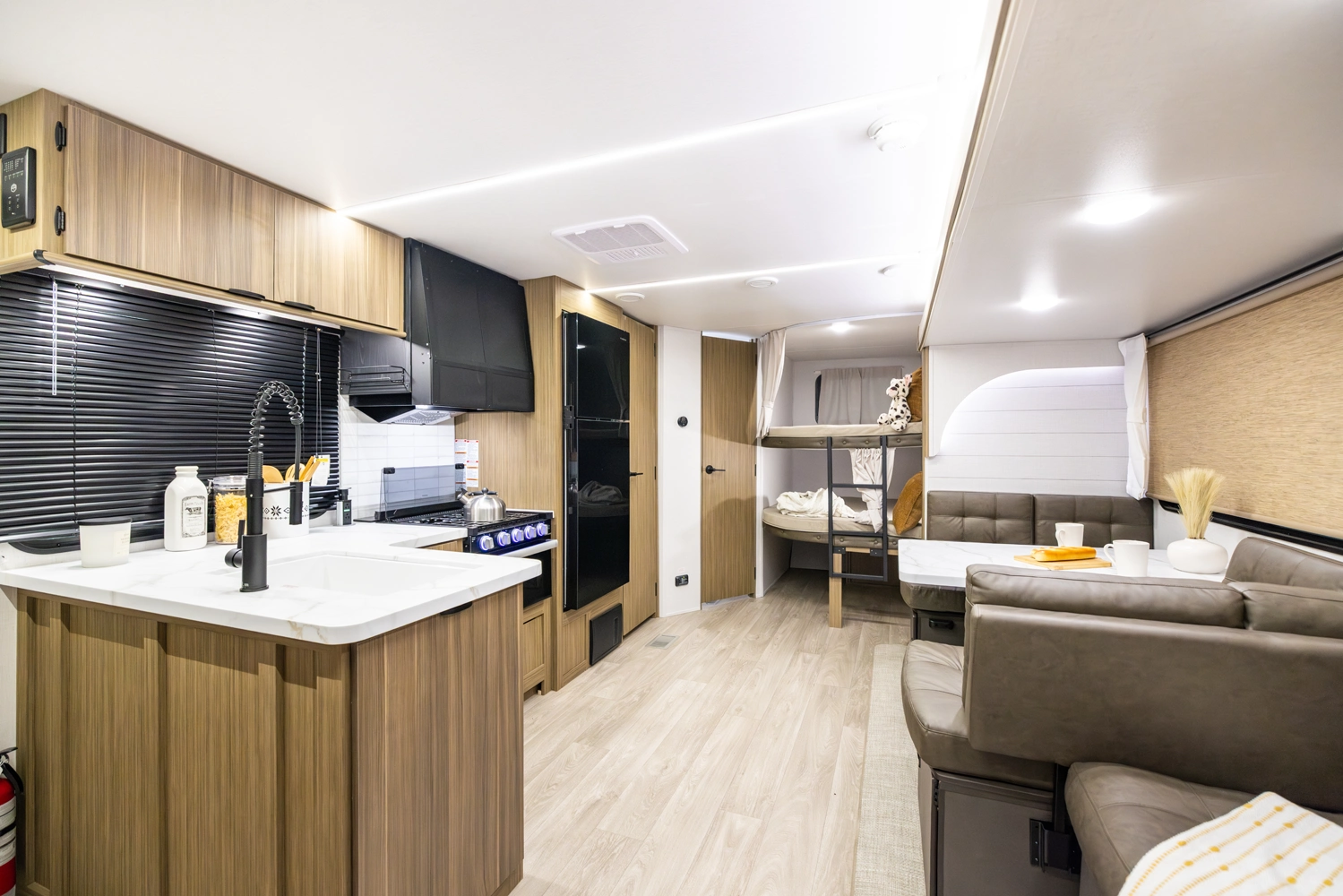 The 26DBUD is the perfect family travel trailer, with double bunks at one end and a queen bedroom at the other. You also get a fireplace (heater), full kitchen with glass-fronted cabinetry and large pantry, a U-dinette, and the customizable Versa-Lounge with Stow N Go Storage.