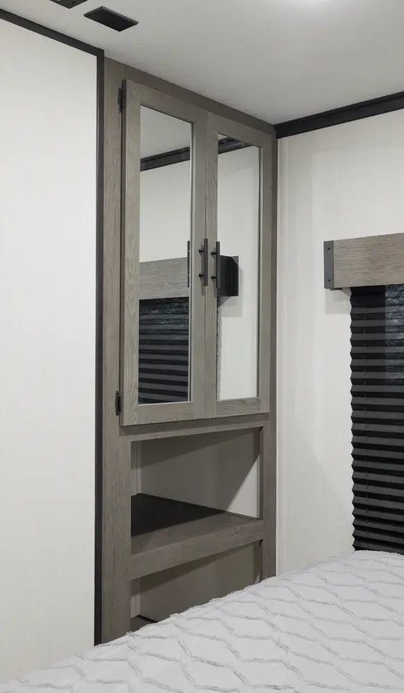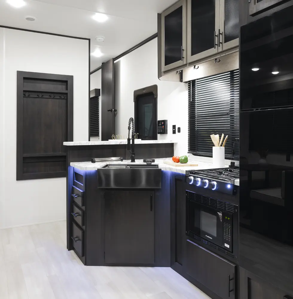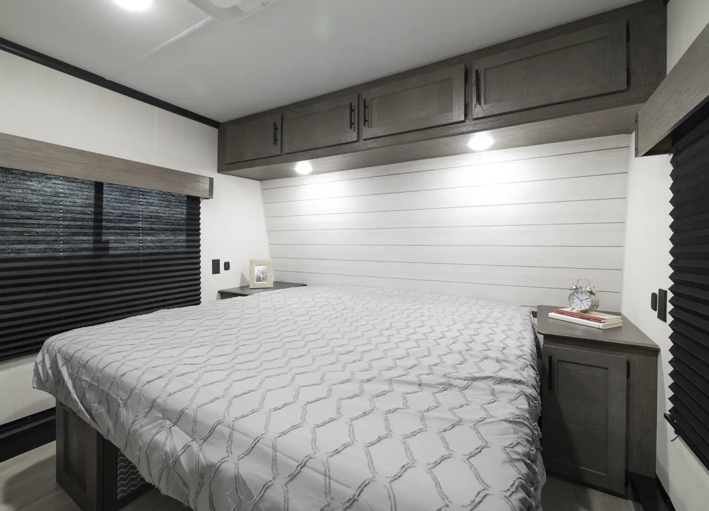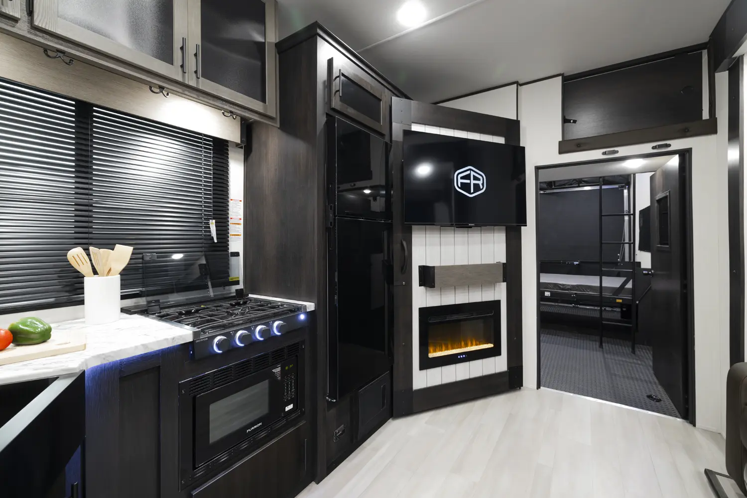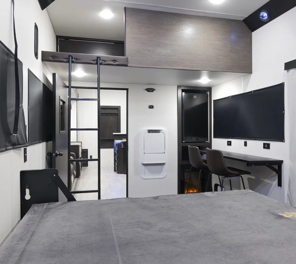 The Wolf Pack 350PACK15 Toy Hauler 5th Wheel by Forest River combines versatility and comfort. Its 15-foot garage doubles as an extra bedroom and features a sliding glass door for a bright, open feel. The kitchen and living area offer hidden pantry storage behind the entertainment center, cozy theater seating, and a dinette that converts into a bed. The primary bedroom boasts a king-size bed with no slide-out for reduced hitch weight, making this model perfect for adventurous families.