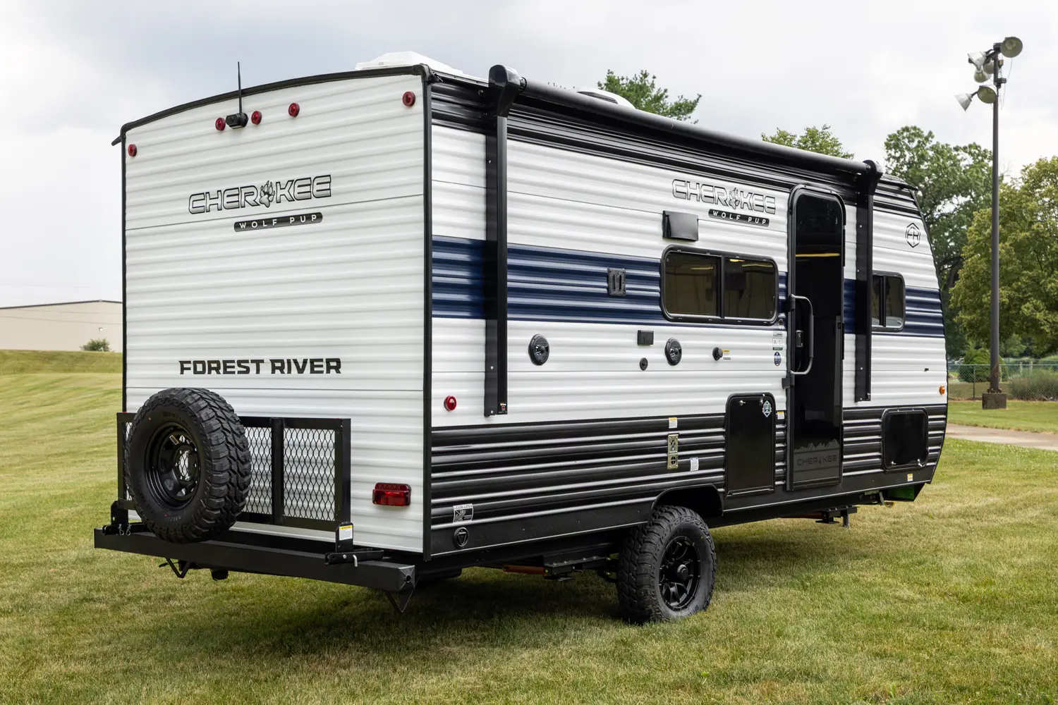 • Cherokee Black Label Wolf Pup (Deep Tinted Frameless Automotive Glass Windows, High Gloss Gel Coat Exterior Sidewalls, Multicolor Reading Lights, Pillowtop Mattress Upgrade, Power Tongue Jack, Pull Out Sprayer Faucet, Solid Surface Countertops, Thermo Foil Arctic Insulation)