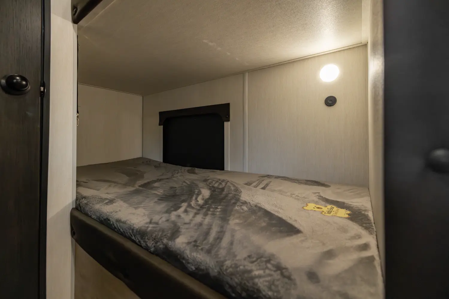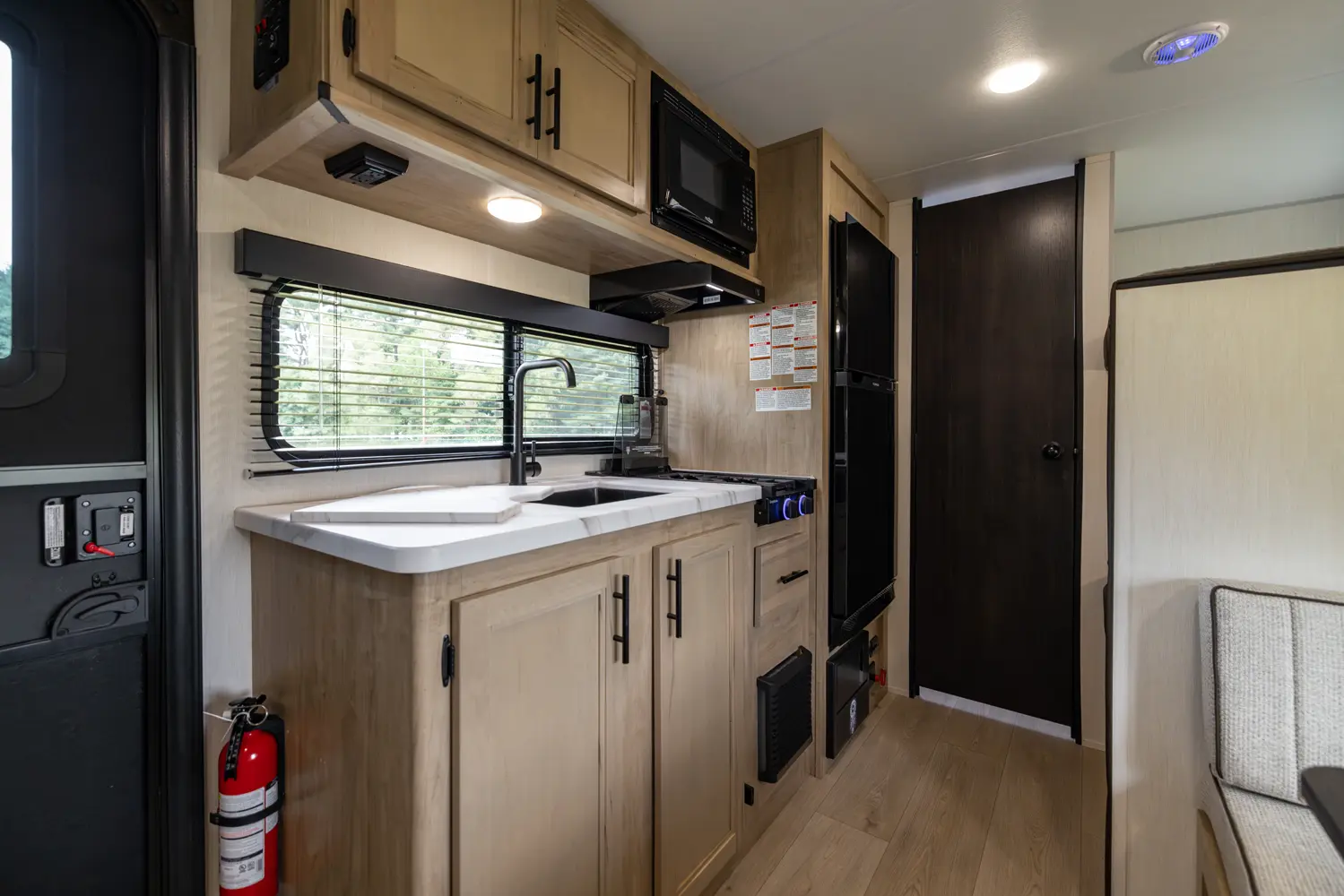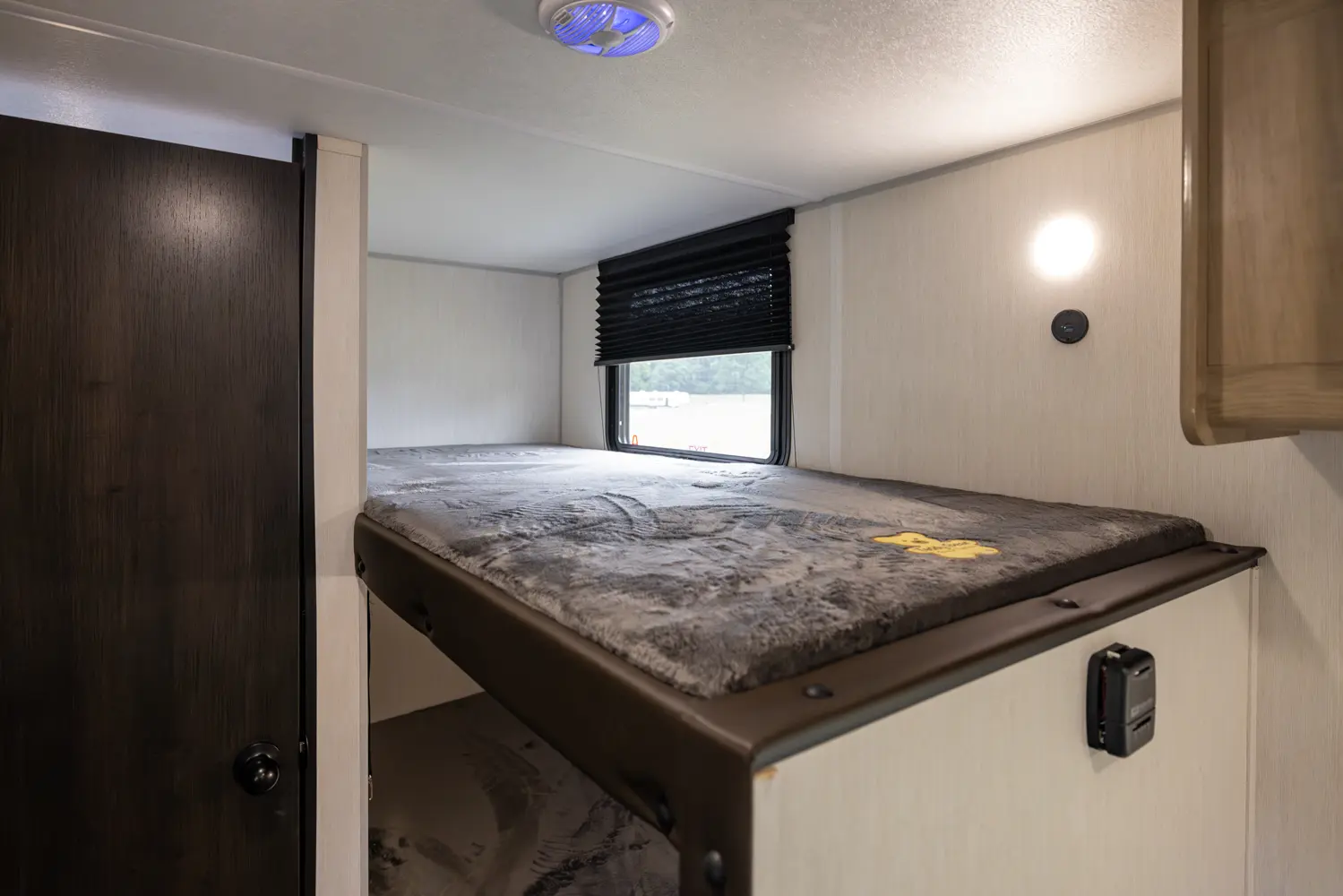 Providing sleeping for as many as 5, this family friendly trailer has a large kitchen with a flush mount glass cooktop, huge sink, ample counter space, and a 10.3 cu.ft. double door refrigerator. There is storage throughout the trailer with a large exterior pack and play door to access storage under the bottom bunk. Exterior features include full-size power awning, mini kitchen, MORryde stable step, RVQ quick connect system, standard coach stabilizing system, and LED lighting.