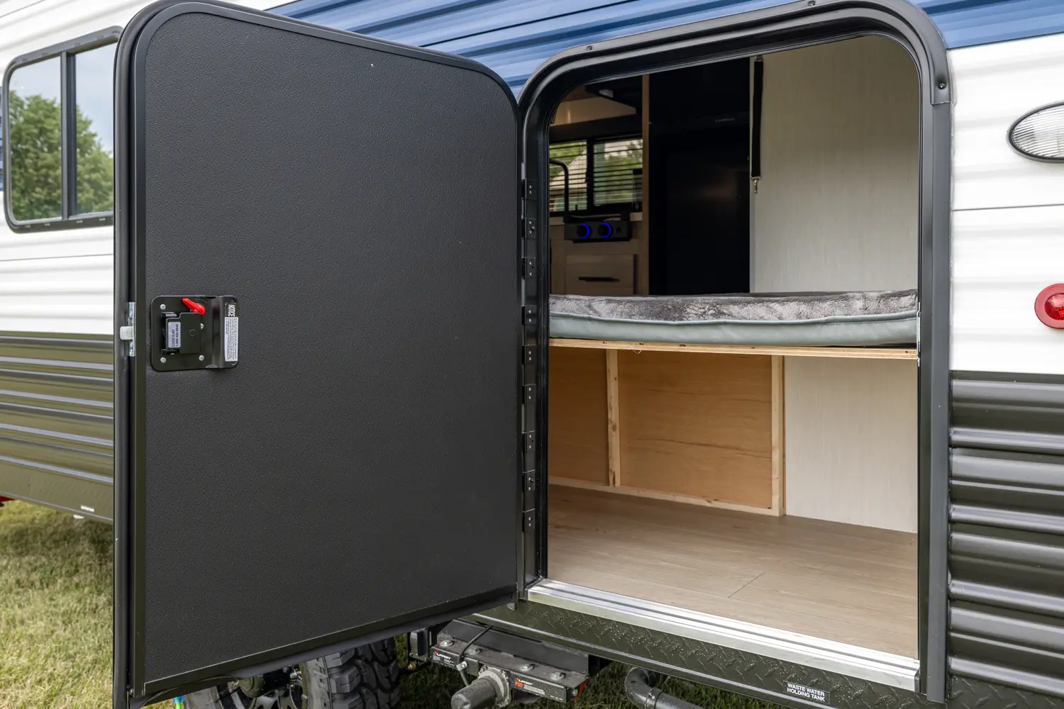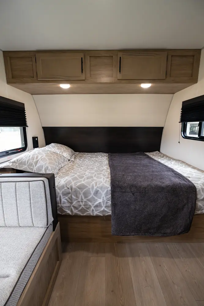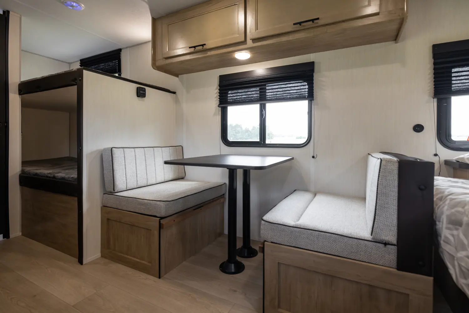 Providing sleeping for as many as 5, this family friendly trailer has a large kitchen with a flush mount glass cooktop, huge sink, ample counter space, and a 10.3 cu.ft. double door refrigerator. There is storage throughout the trailer with a large exterior pack and play door to access storage under the bottom bunk. Exterior features include full-size power awning, mini kitchen, MORryde stable step, RVQ quick connect system, standard coach stabilizing system, and LED lighting.