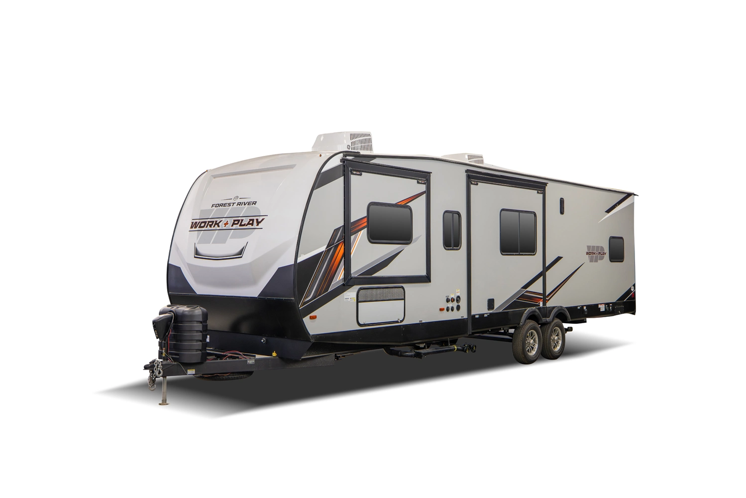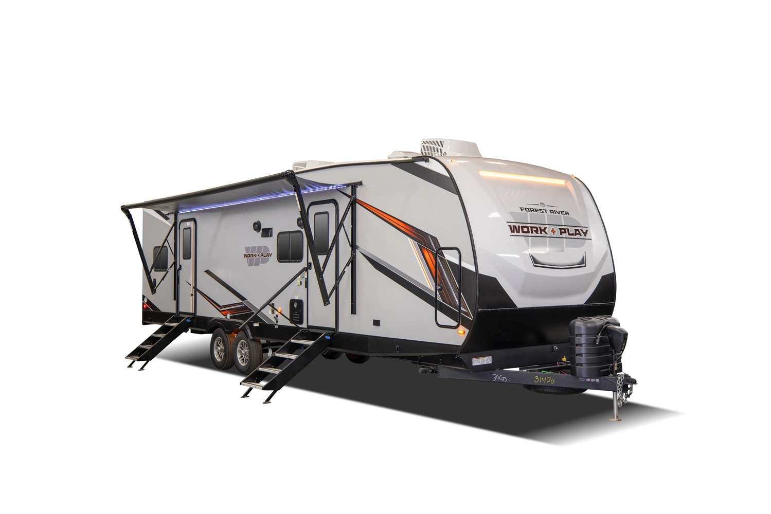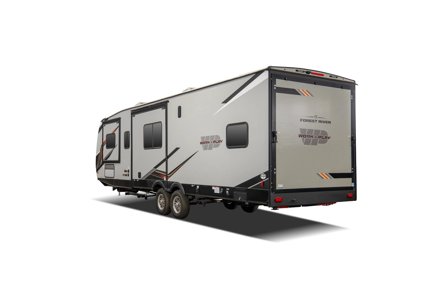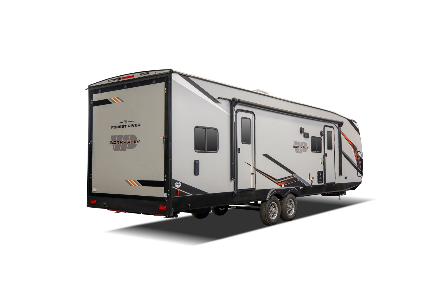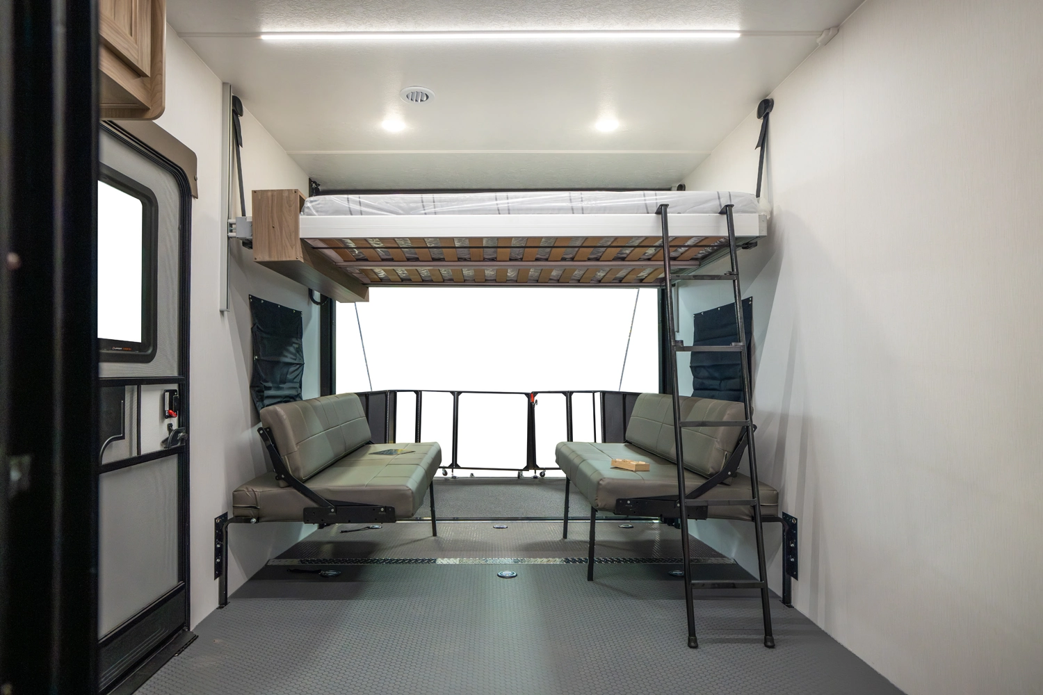 The Work & Play 30GS is built for long-haul adventure. With nearly 38 feet of length, this model carries large gear with ease and still offers a well-appointed cabin for downtime. The robust frame, ramp door, and cargo tie-downs make it a reliable partner for cross-country trips to remote outdoor destinations.