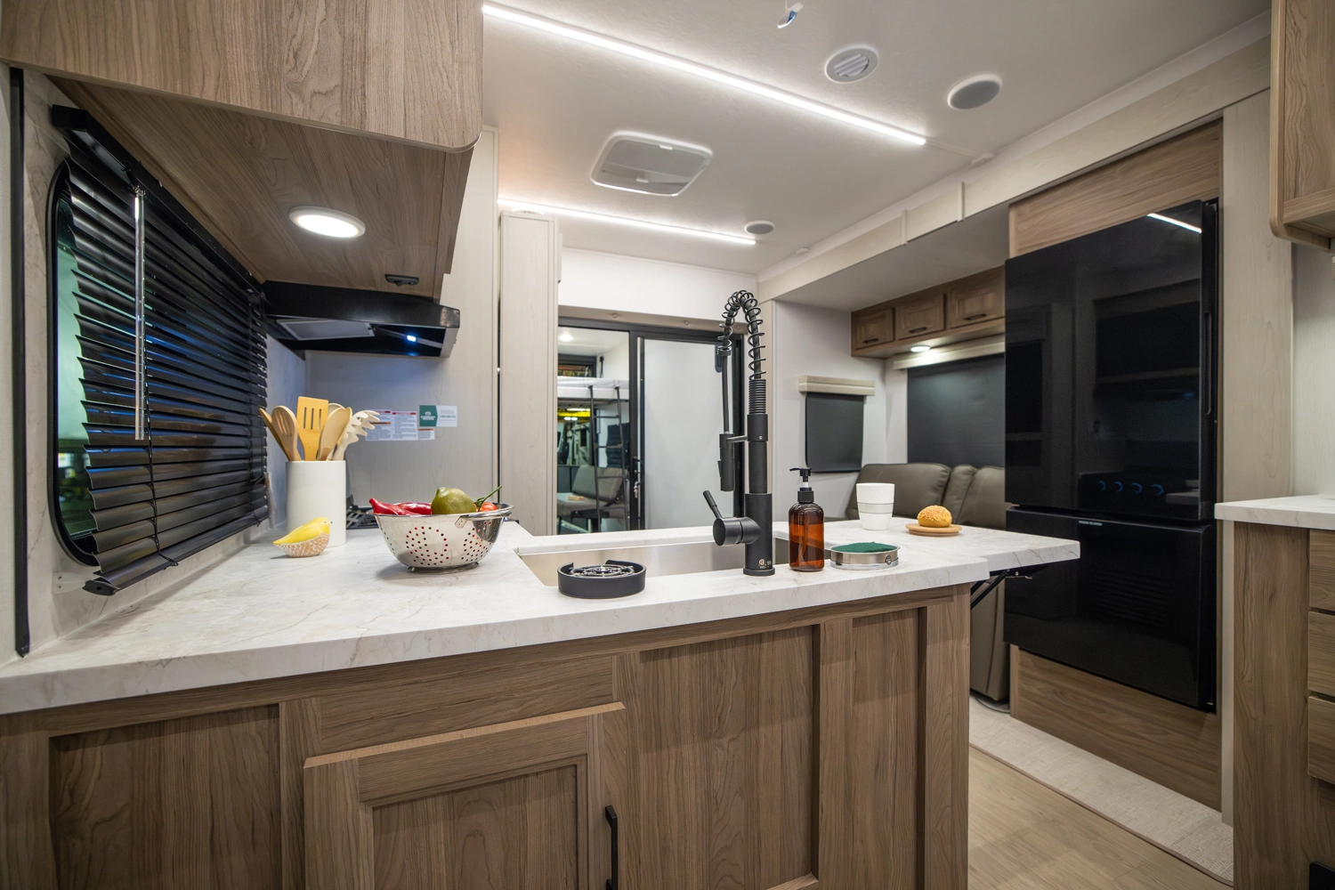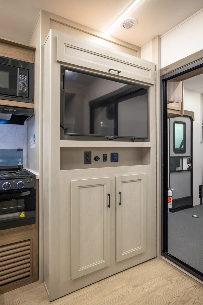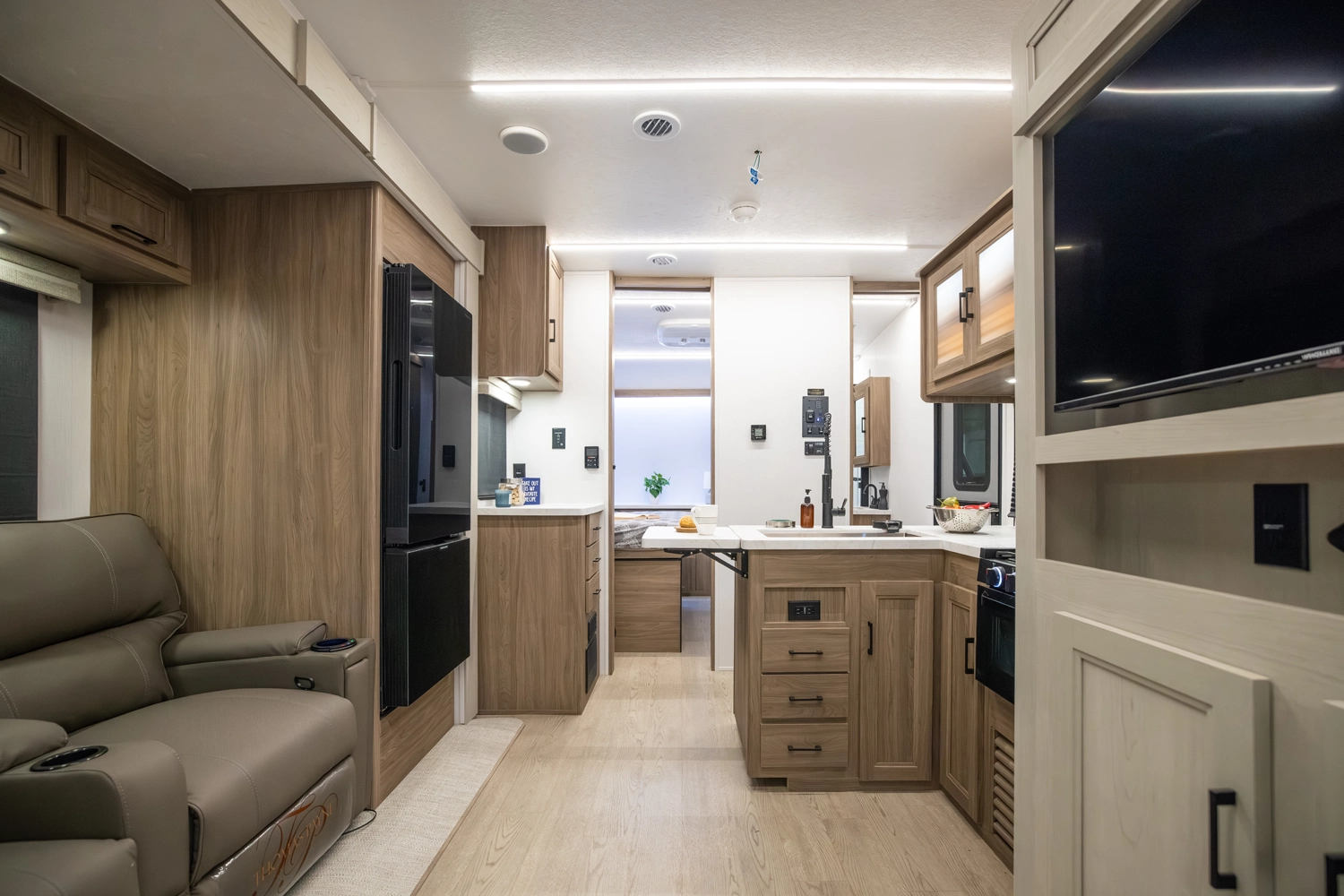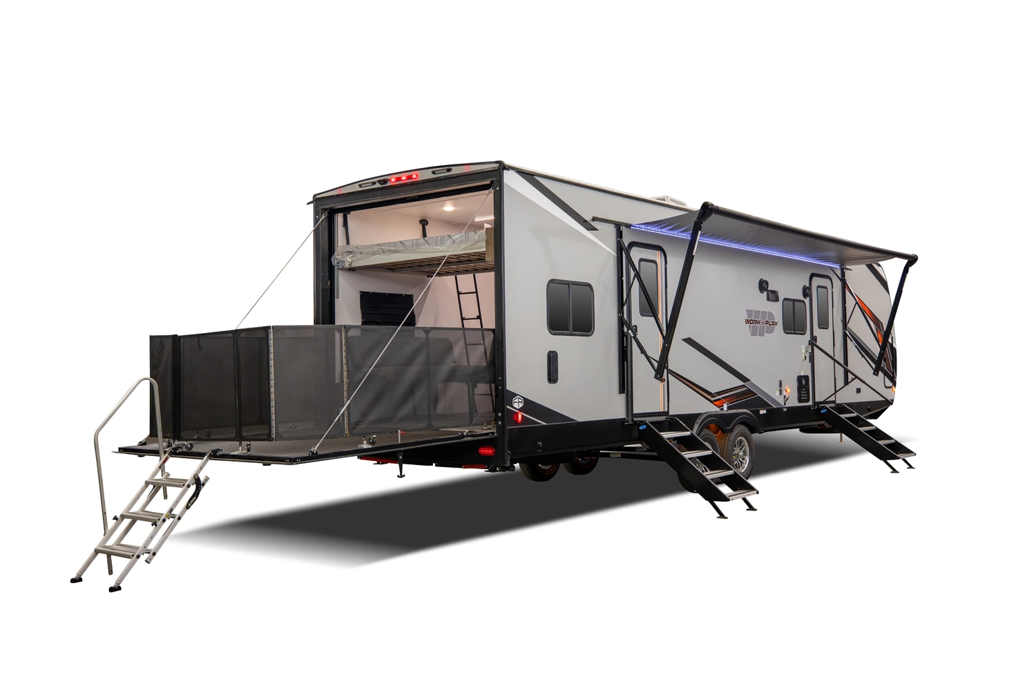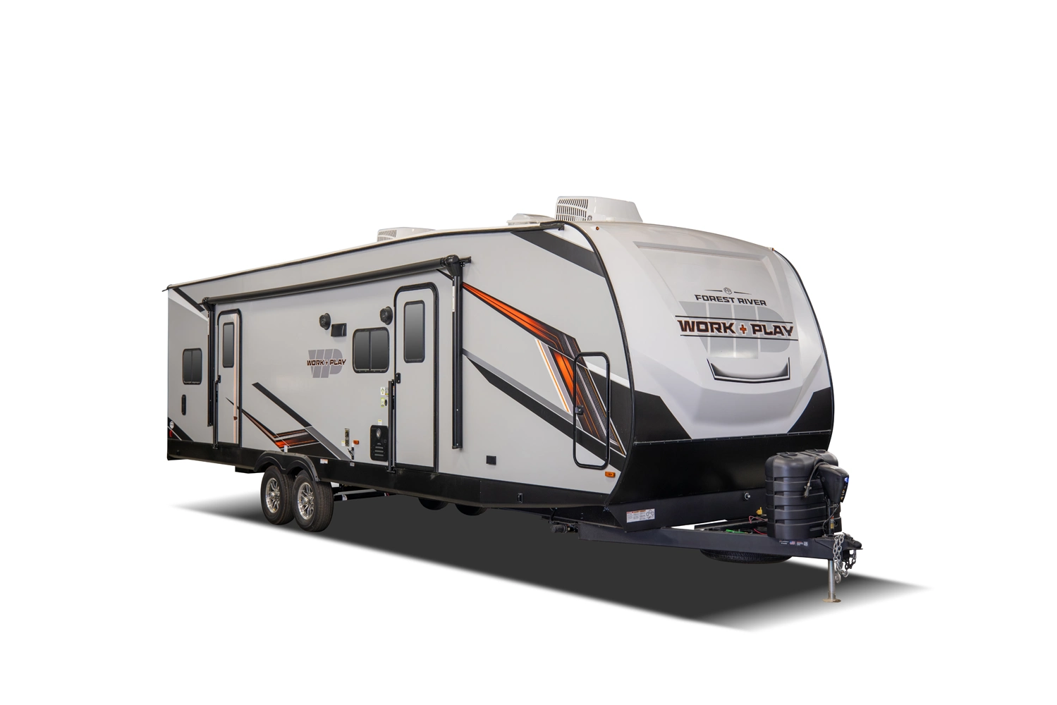 The Work & Play 30GS is built for long-haul adventure. With nearly 38 feet of length, this model carries large gear with ease and still offers a well-appointed cabin for downtime. The robust frame, ramp door, and cargo tie-downs make it a reliable partner for cross-country trips to remote outdoor destinations.