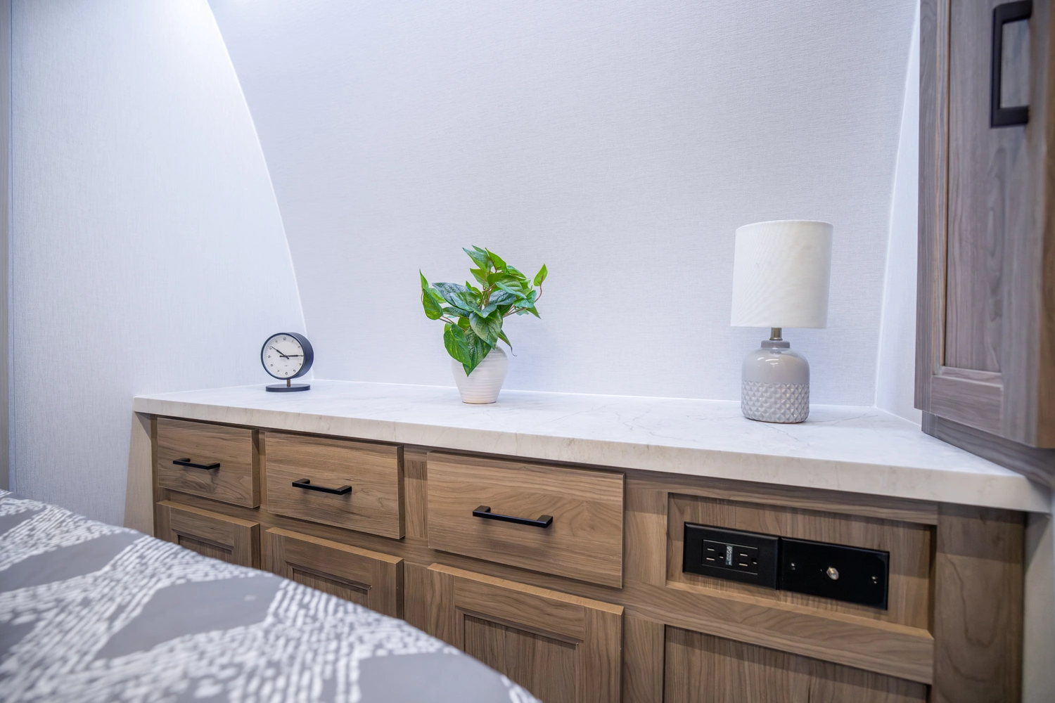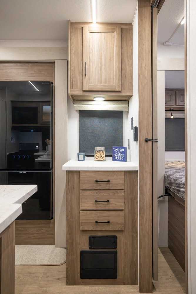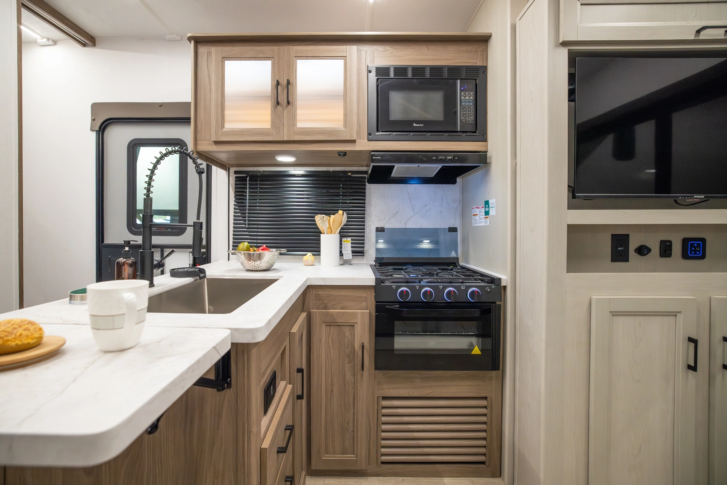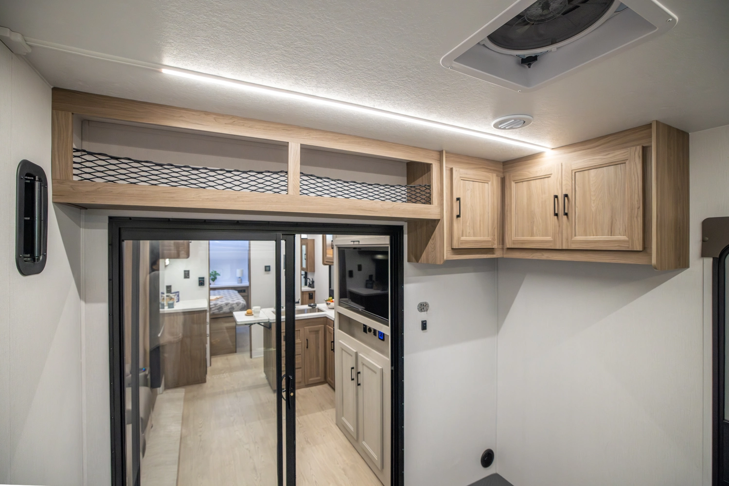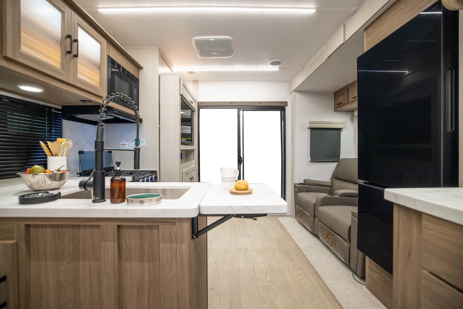 The Work & Play 30GS is built for long-haul adventure. With nearly 38 feet of length, this model carries large gear with ease and still offers a well-appointed cabin for downtime. The robust frame, ramp door, and cargo tie-downs make it a reliable partner for cross-country trips to remote outdoor destinations.